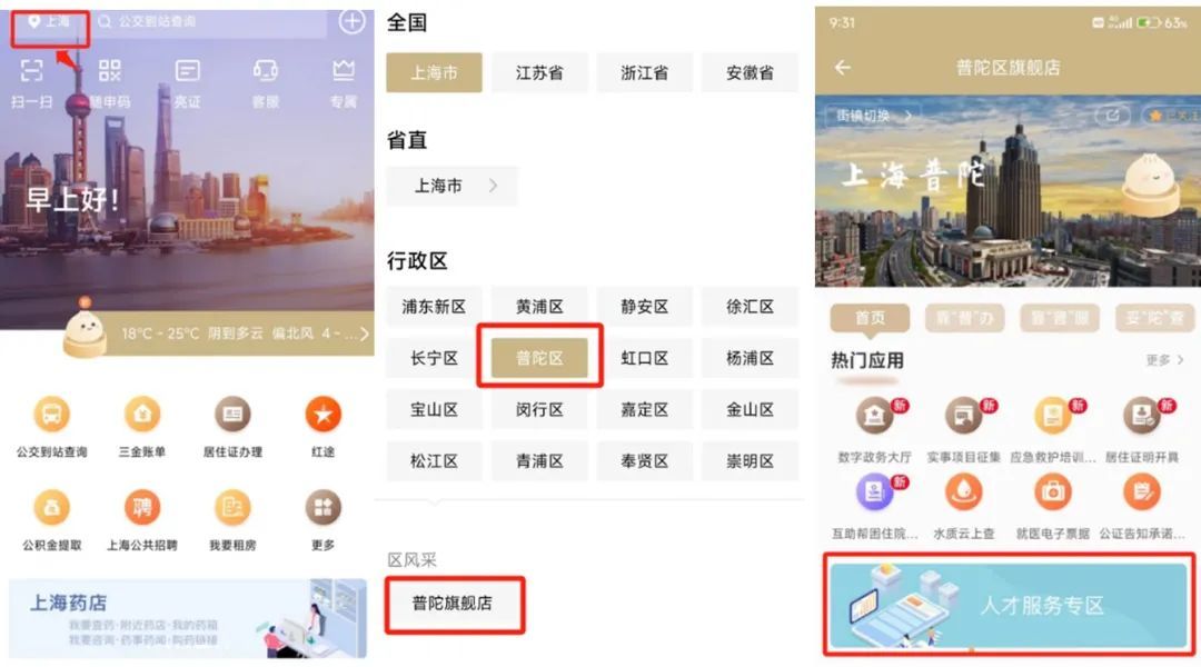 进入随申办APP首页,点击红框处的上海,然后点选普陀区后,再点击下方的普陀旗舰店,即可进入到区旗舰店主页中,然后在主页中的红框所示处,就可以找到人才服务专区啦。