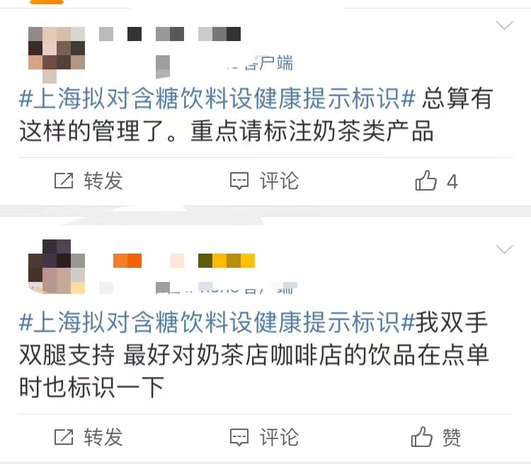 此前,对于含糖饮料的健康提示标识,有网友表示:“强烈建议奶茶店也要贴一下呀!”