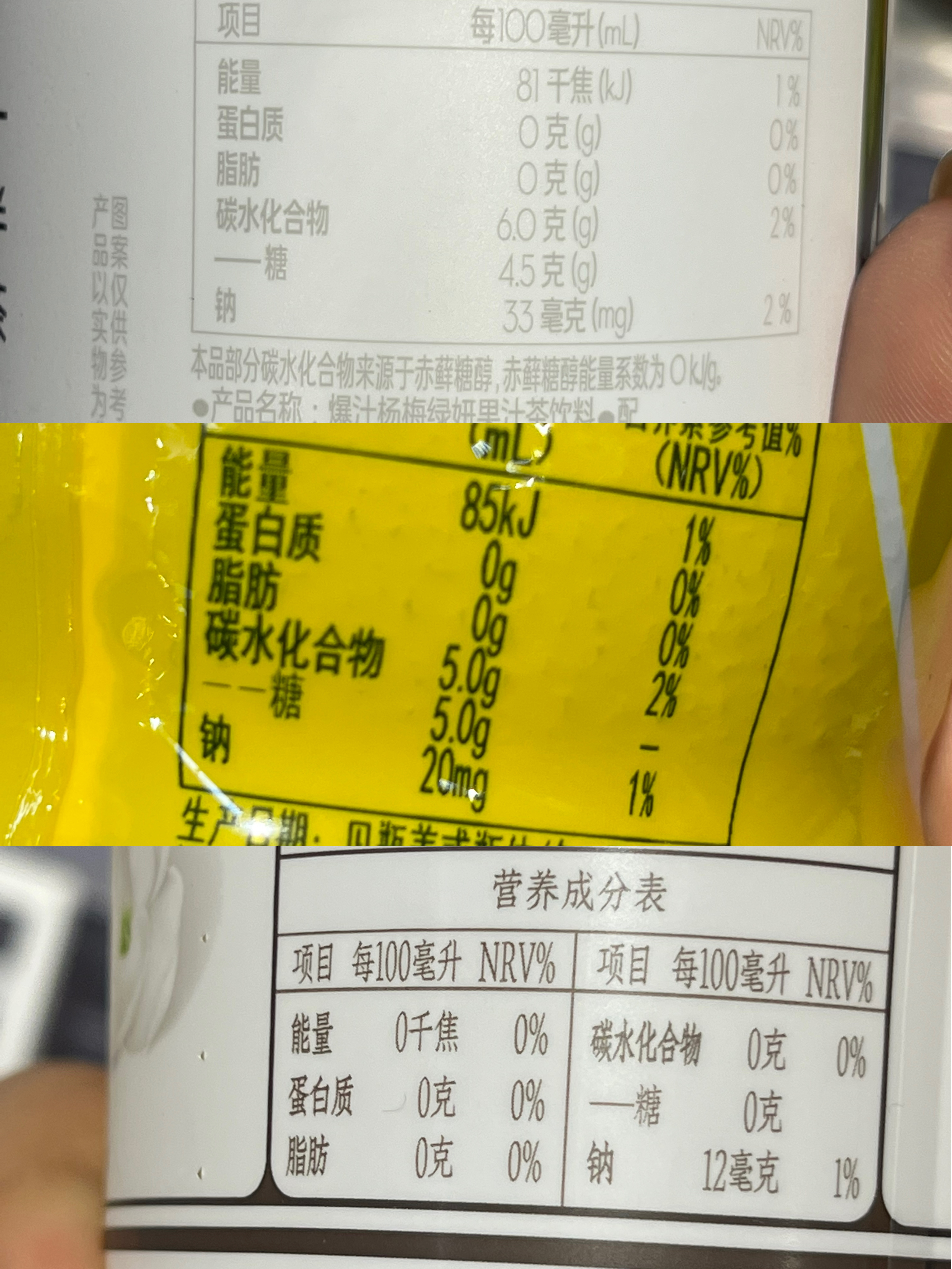 在瓶身上标注了“低糖”的饮料,大多在营养成分表中都标注了每100毫升的含糖量。