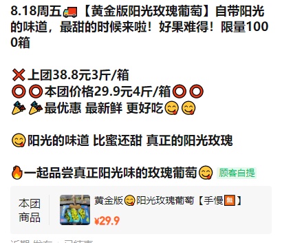 “今年的阳光玫瑰价格的确腰斩,去年我们团购还在15-20元每斤,今年团购价只有5-10元每斤!”南京市建邺区双闸街道社区团购豆米团团长告诉记者。记者看到,他10月7日刚开的团购链接上,3斤一箱的极品晴王葡萄只要29.9元,开团记录显示去年同样的晴王一箱3斤的要49.9元—59.9元。除了晴王,普通的阳光玫瑰更便宜,另外一个链接显示一箱4斤只要29.9元。
