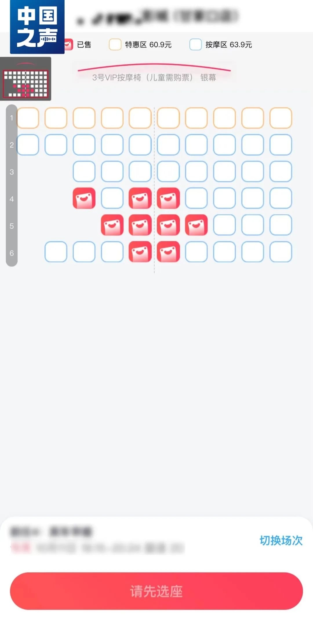 记者还发现,不同影院之间不仅价差不同,“黄金区域”占比也不同。不同区域的价差少则3到5元,多则十几元不等。北京海淀区甘家口附近的一家影院线上选票系统显示,其3号厅特惠区售价60.9元,按摩区为63.9元。只有第一排是特惠区,其余区域全部为按摩区,但就算坐在按摩区,想要享受按摩服务,还要再付钱。