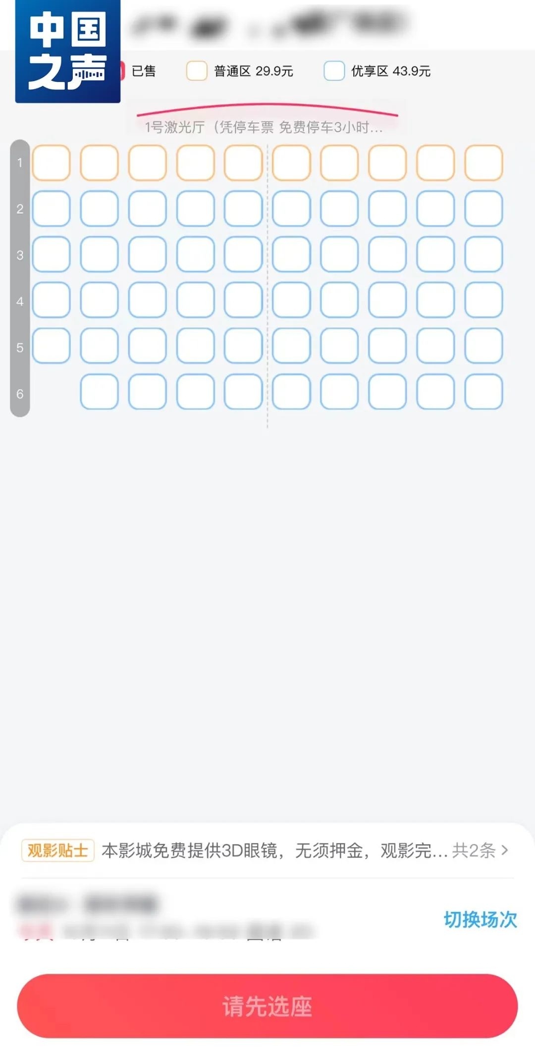 但值得注意的是,这家影院的线上选票系统显示,激光厅除第一排10个座位为普通区外,其他座位全部为优享区。这家影院的工作人员表示,“分区售票”是几个月前开始调整的。