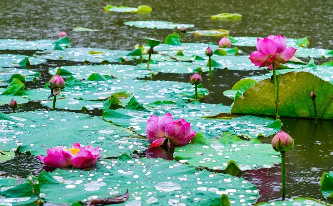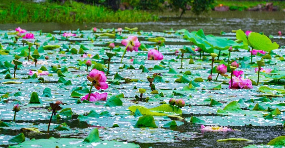 ‘国庆红’荷花,顾名思义,它以鲜艳的花色、特长的花期,甚至能延续至国庆节左右。这是一种大株形的荷花品种,单朵花期特别早,从6月中旬就开始盛开,群体花期一直持续到国庆节后,整整有112余天。这让它成为了荷花中的“长青树”,一直迎接着游客的到来。
