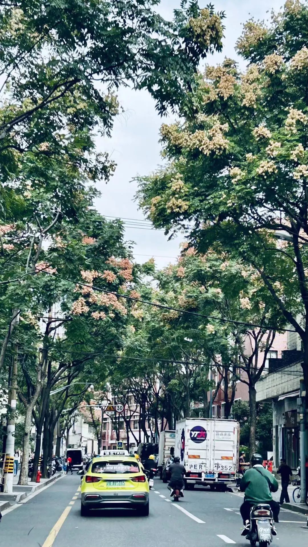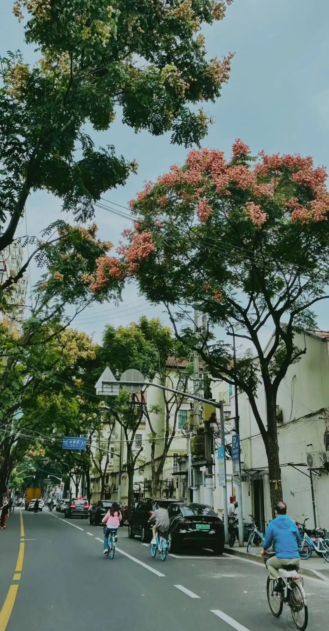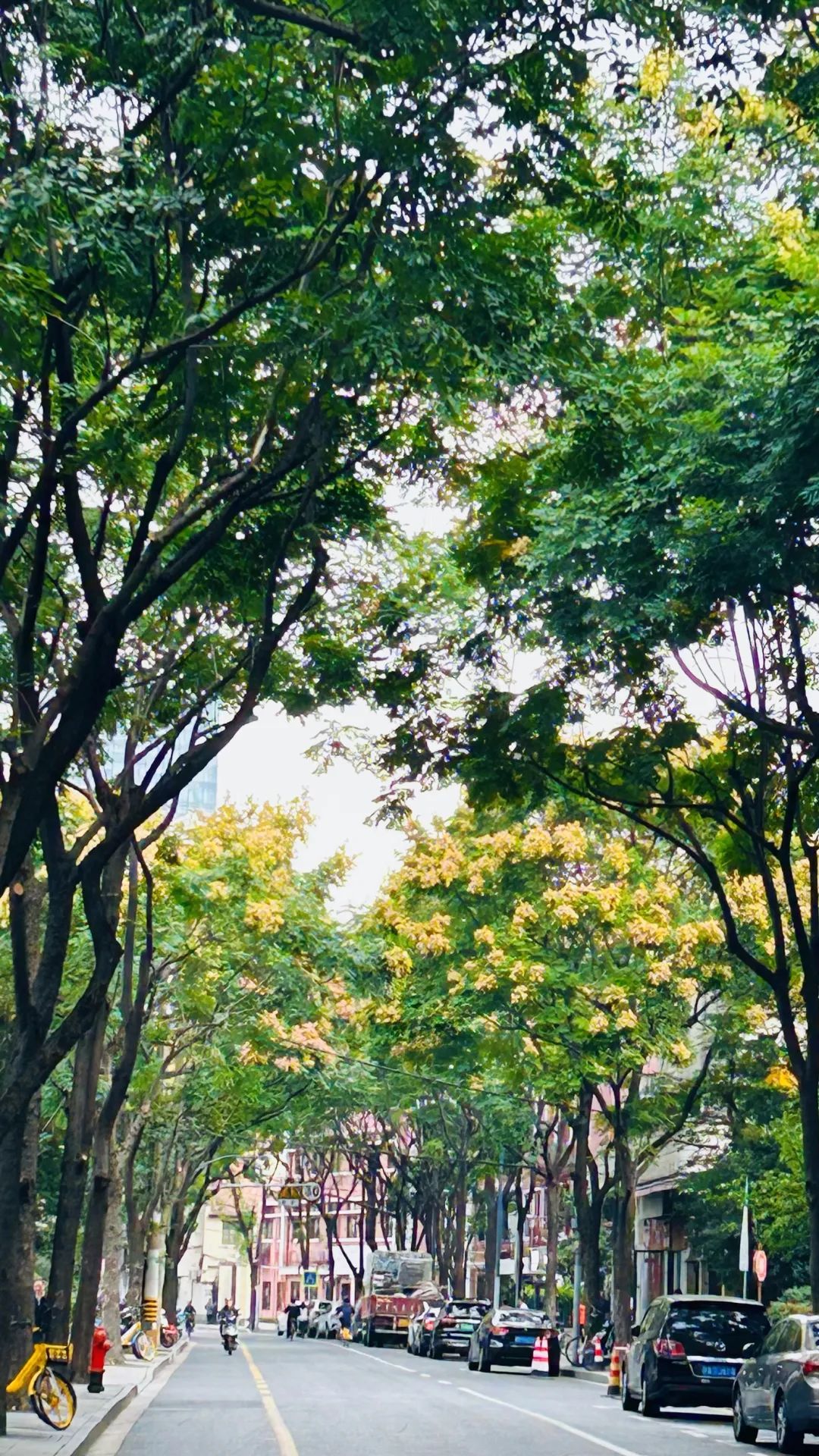 在衡复风貌区徐汇区域内,除了梧桐,还有唯一一条马路,两边种满了栾树;初秋时节,微风吹过,满地金黄的小花,秋意渐浓,黄花落尽,如红色灯笼般的栾树果就在枝头绚烂;这条以栾树为行道树的马路就是徐汇区天平街道的嘉善路。