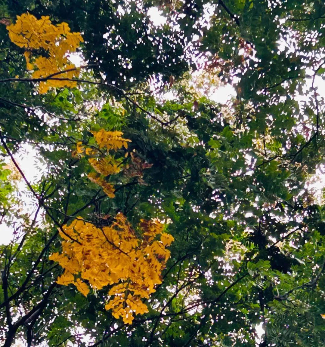 不过,在高高大大的栾树枝叶间,还有一簇簇橙黄夹杂其间,色彩有些像银杏,这是栾树叶吗?