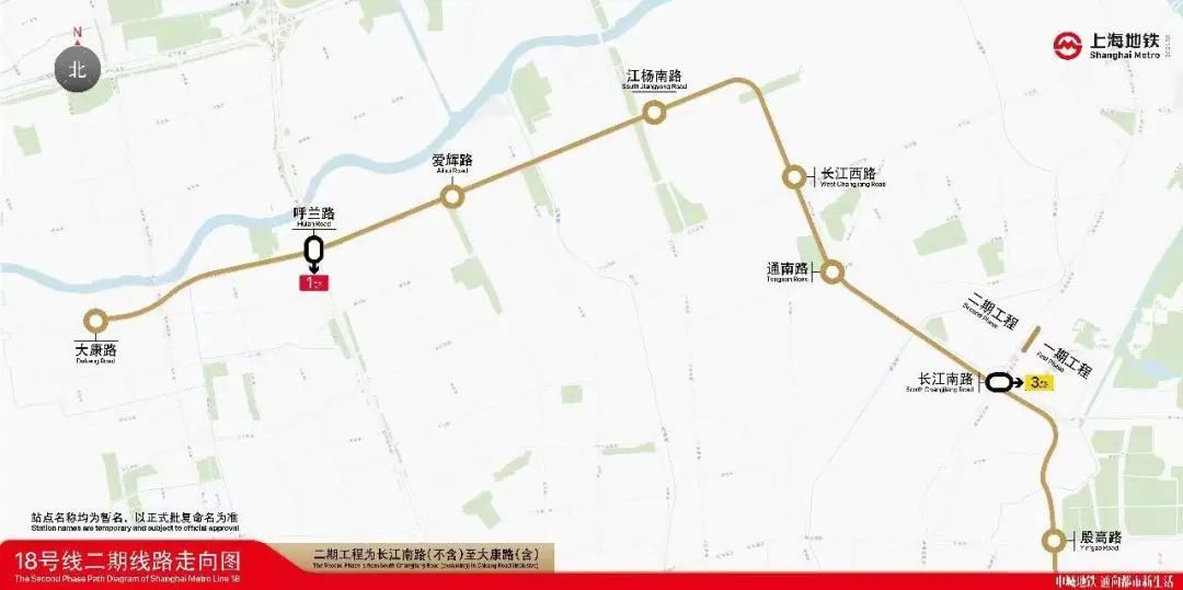 18号线二期自18号线长江南路站北端头井(不含)至大康路站,线路长约8.1公里,设车站6座,目前已全面进入车站主体土建施工阶段,首个区间:长江西路站—江杨南路站下行线盾构区间于近日贯通。此外,通南路站、呼兰路站基坑开挖施工,爱辉路站、大康路站围护结构施工,长江西路站—江杨南路站区间上行线盾构推进。详见↓
