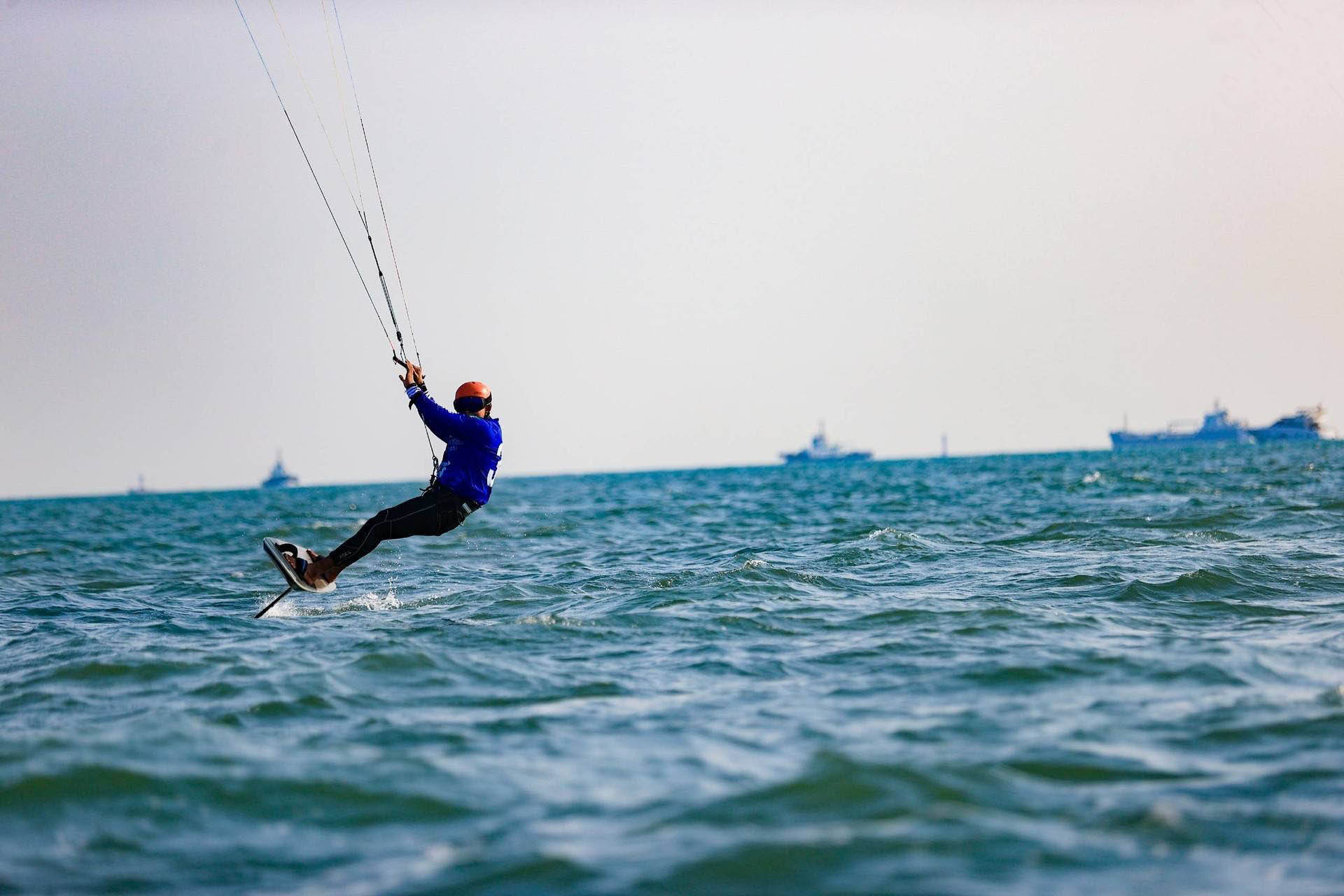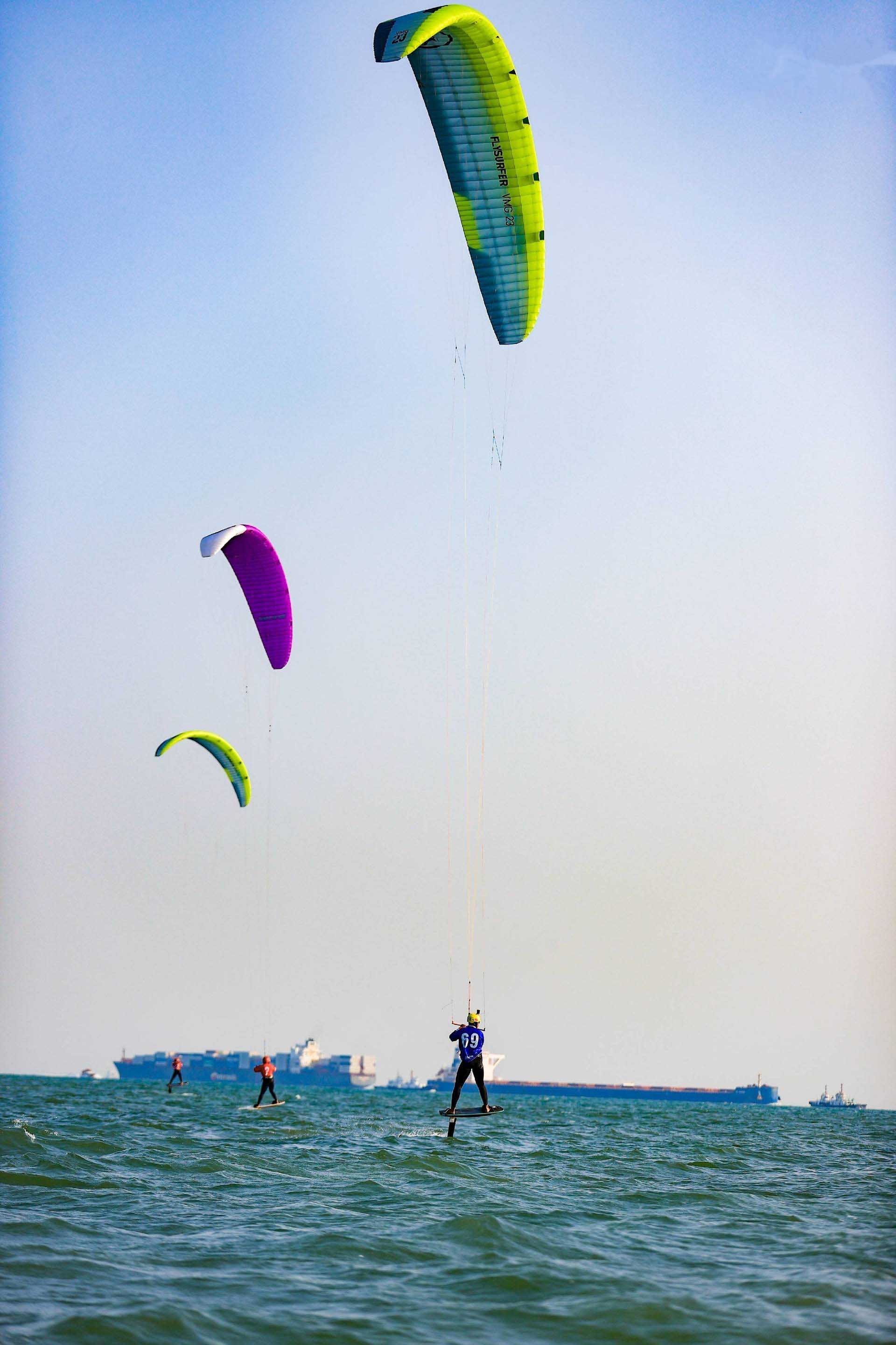 近年来,风筝板运动也逐渐成为帆船舞台上的“后起之秀”,是一项非常具有挑战性和观赏性的新兴水上运动项目。这项运动的器械是由一面充气风筝再加一个冲浪滑板组成,运动原理是通过风筝在空中获取风的能量,再以高强度的绳索传递给运动员,运动员利用风能脚踩冲浪板完成在水面的滑行,并可通过变换风筝的姿态来获取额外动力完成跳跃。选手只需要脚踩水翼板、手拉风筝线就可完成,就像是在海上放风筝一样,充满趣味性和刺激性。