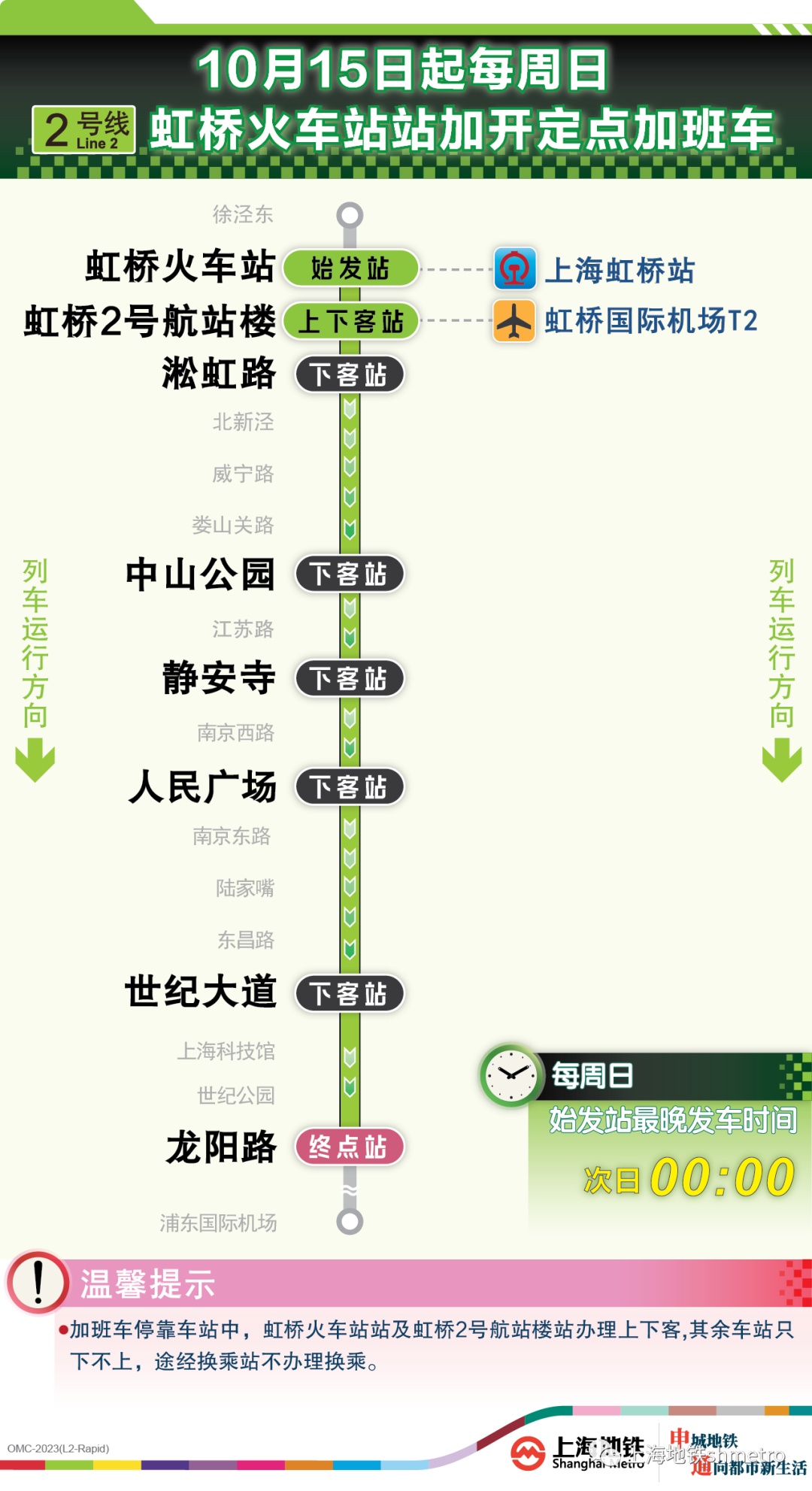 根据计划,2023年10月15日起至另有通知时止,每逢周日,上海地铁2号线将在虹桥火车站站常态定点加班车的基础上再增开两班定点加班车,其中第一班增开定点加班车在虹桥火车站站发车时间为23:45分;第二班为次日0点。