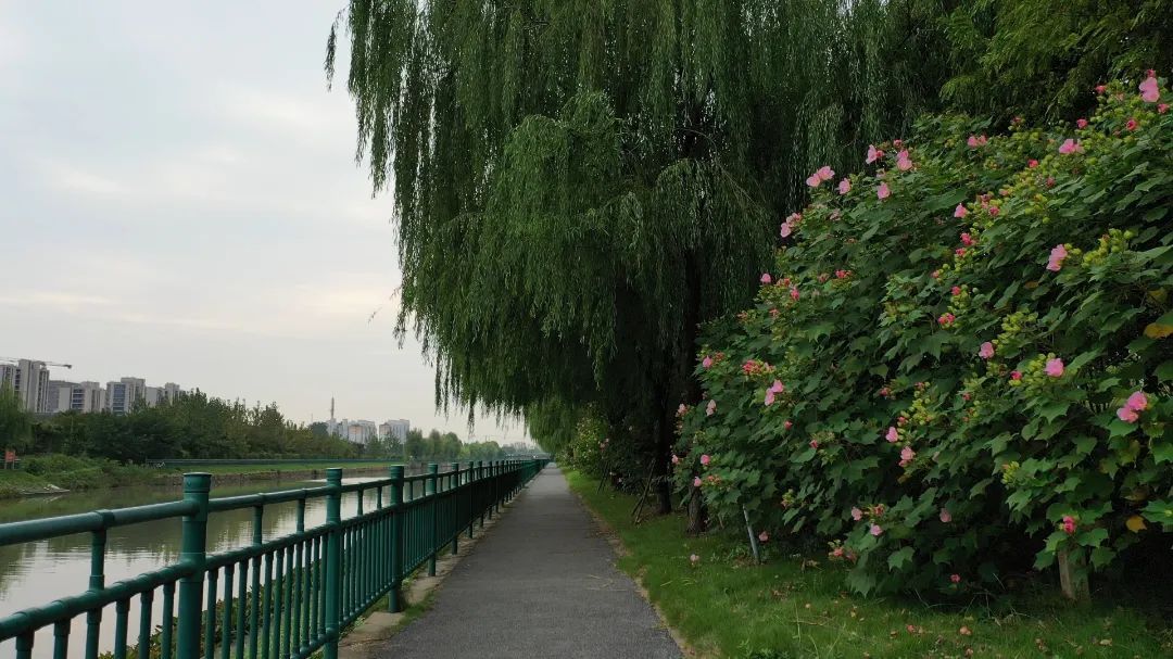 在白沙公园,目前最适合赏花的地点位于湄浦河北岸的一片区域,前几年种植的木芙蓉整齐排列在河岸边的公园绿化带里,与稀疏的柳树相依相伴、相互点缀,粉红的花朵、翠绿的枝叶、不时吹来的微风,无不让人感到惬意。
