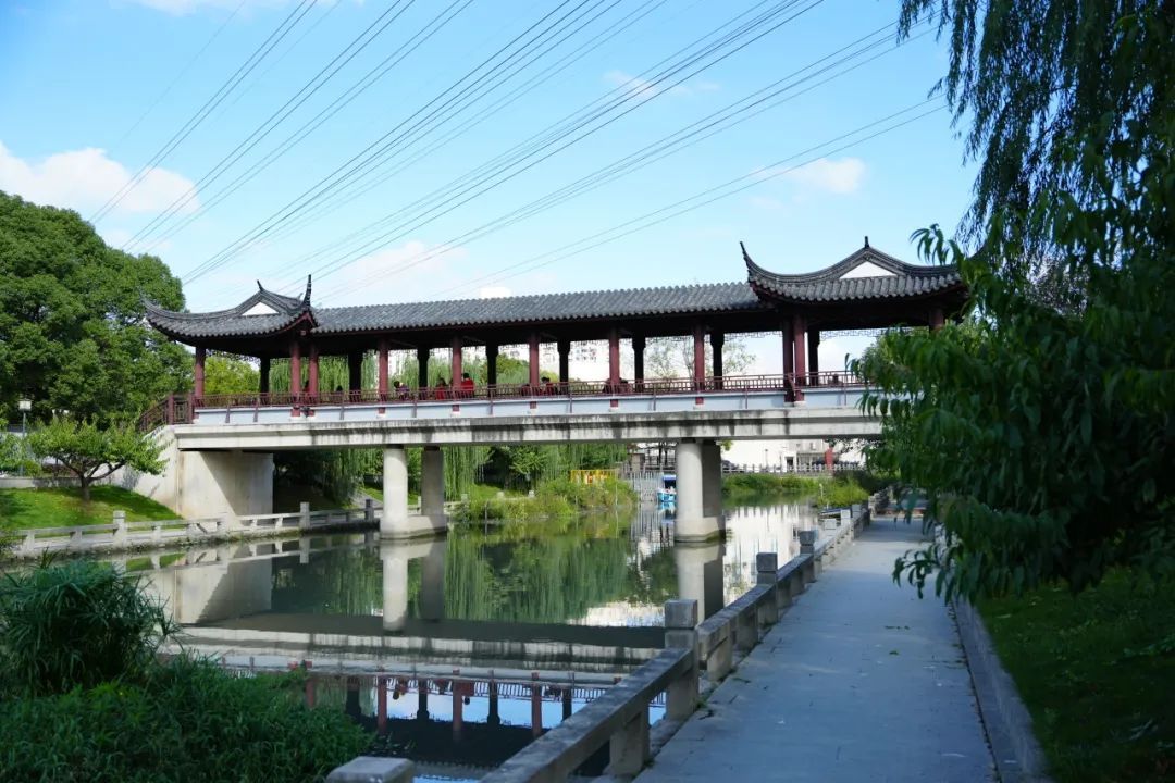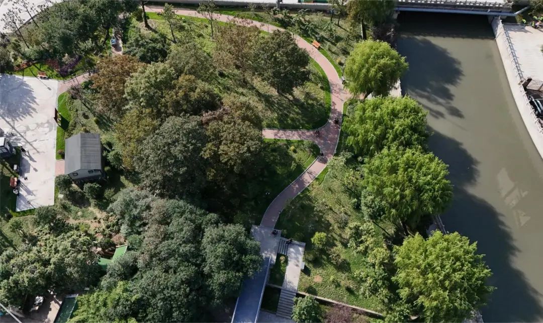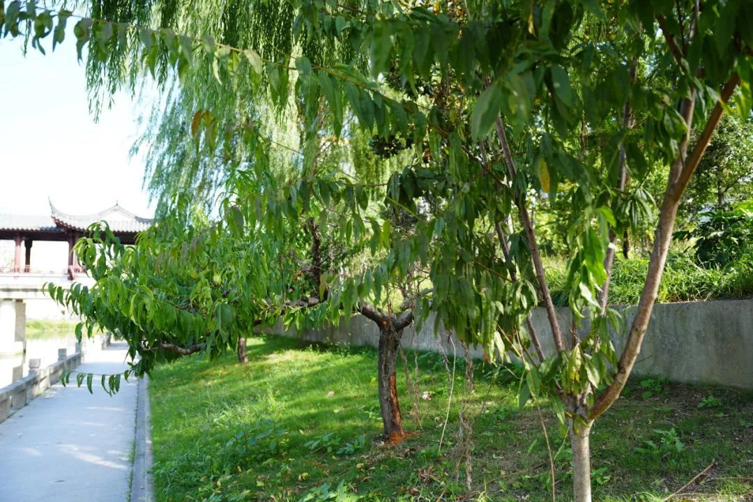 “整个桃溪公园的游玩性是很强的。首先设计上通过对桃浦河河岸的利用,建设过程中对原有地形合理调整,高低起伏别有生趣;其次,参照西湖景观苏堤春晓的设计理念,河岸对面是柳树,河岸另一侧是桃树,再通过古朴的廊桥将两岸相连,打造一桃一柳的绿化景观。”普陀区园开公司养护部技术总监须磊描述道。
