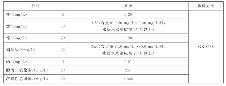 合格的矿泉水,必须有一项或多项达到界限指标的要求,其要求含量分别为(单位:mg/L):锂、锌、碘化物均≥0.2,硒≥0.01,溴化物≥1.0,偏硅酸≥25,游离二氧化碳≥250和溶解性总固体≥1000。
