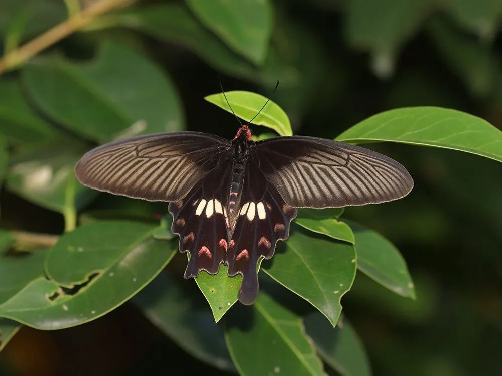 大型蝴蝶,身体为红色,翅膀为黑褐色,后翅有7个红色圆斑以及2-3个小白斑。红珠凤蝶飞行缓慢而优雅,喜欢访花吸蜜,市区公园绿地,甚至小区里都可见到它们的舞姿。11月之前可见。