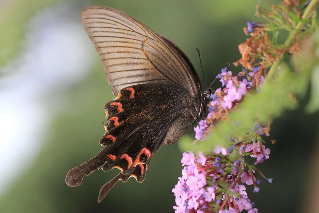 碧凤蝶是上海地区体型最大的蝴蝶之一,翅膀黑色,翅背面散布有蓝色和绿色的鳞片,后翅腹面具有粉红色新月形斑纹。飞行迅速,喜欢访花吸蜜。11月之前可见。