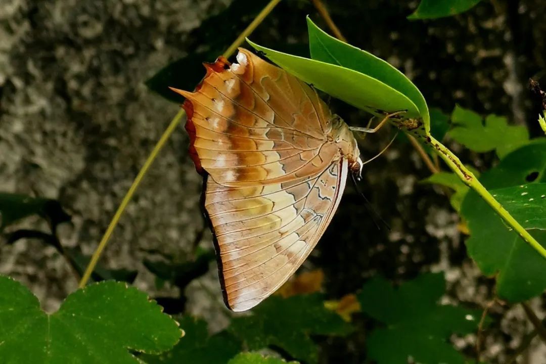 大型蝴蝶,翅膀为橙色,前翅与一条黄白色宽带。白带螯蛱蝶是上海地区身体最强壮的蝴蝶,飞行迅速,喜欢吸食树干流汁或发酵的水果。全上海都有它们的踪影,不过种群密度不太高,需要点运气才能观察到它们呢。11月之前可见。
