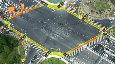 机动车驶入该六岔路口,请按照路口的机动车信号灯和地面车道箭头标线指示行驶。