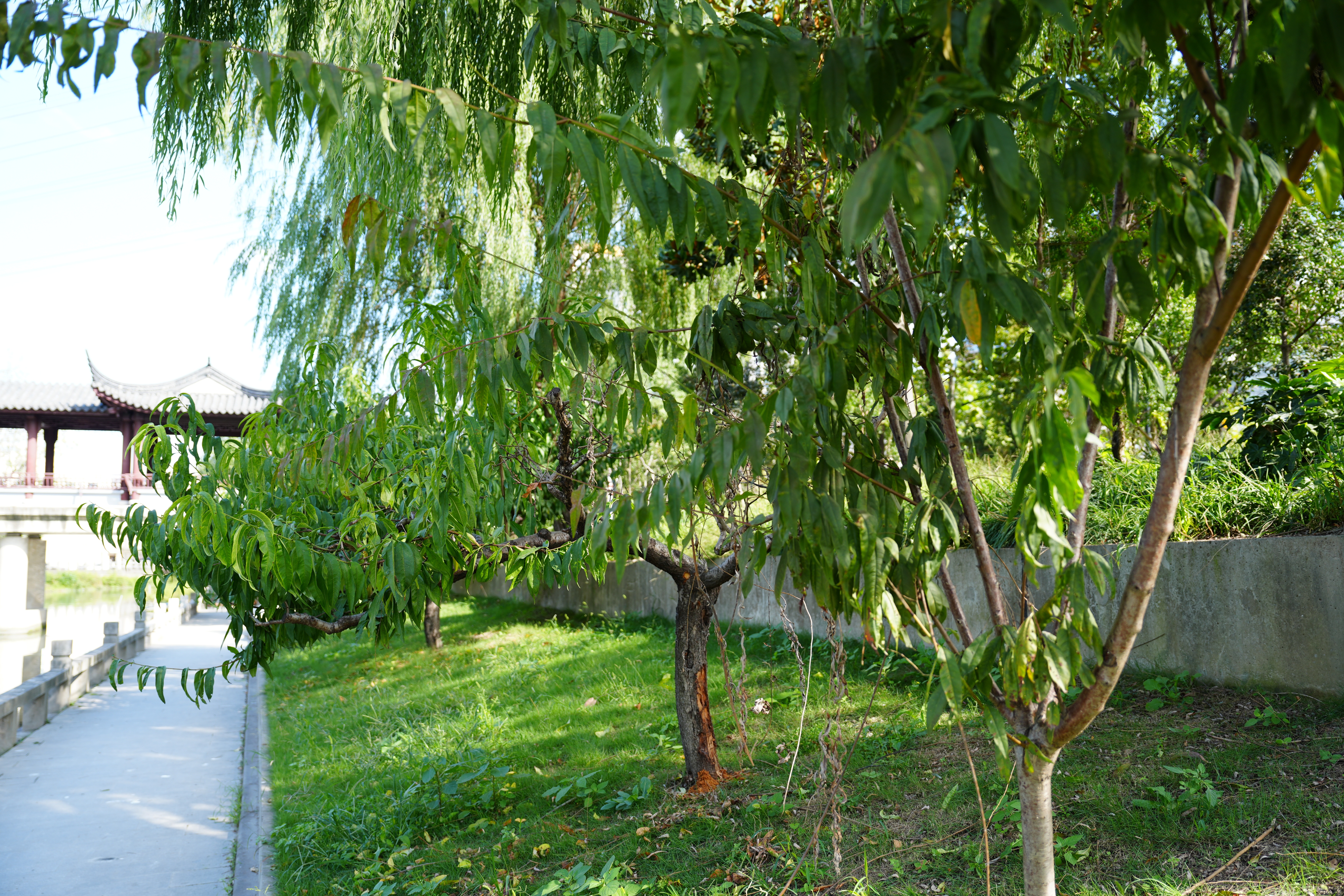 “整个桃溪公园的游玩性是很强的。首先设计上通过对 桃浦河河岸的利用,建设过程中对原有地形合理调整,高低起伏别有生趣;其次,参造西湖景观苏堤春晓的设计理念,河岸对面是柳树,河岸另一侧是桃树,再通过古朴的廊桥将两岸相连,打造一桃一柳的绿化景观。”普陀区园开公司养护部技术总监须磊描述道。