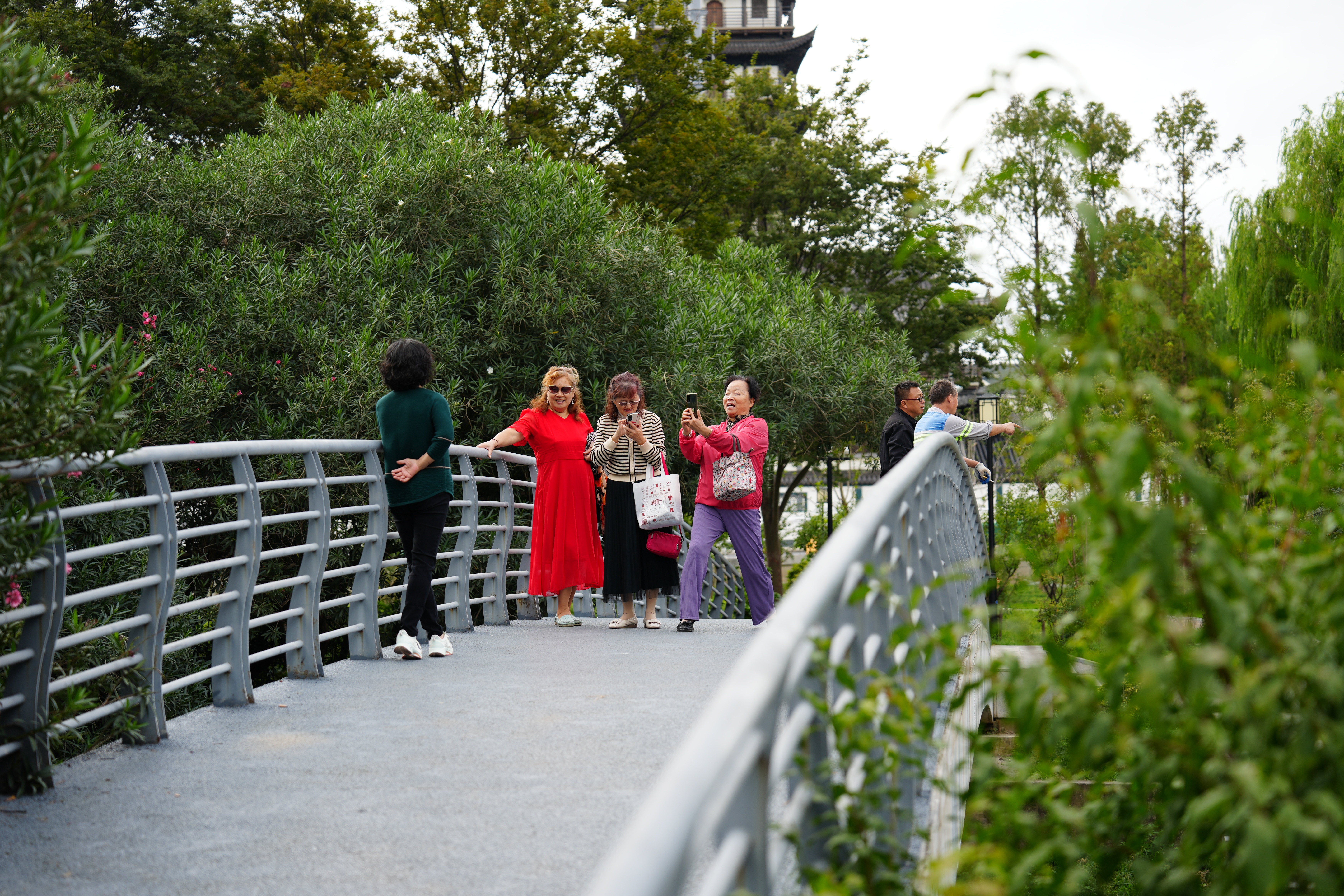 记者赶到桃溪公园,眼前是一幅雅致多彩秋色美景:入园处的花境灵动,几株魁梧的榆树、榉树在阳光下洒下片片斑驳光影,修葺一新的两座跨桃浦河小桥给市民创造了亲近滨河水系的新角度。不少老年人凑在一块儿聊天、下棋,还有爱拍照的市民们三五成群摆出婀娜身姿记录下美妙一刻,整个公园一派祥和景象。