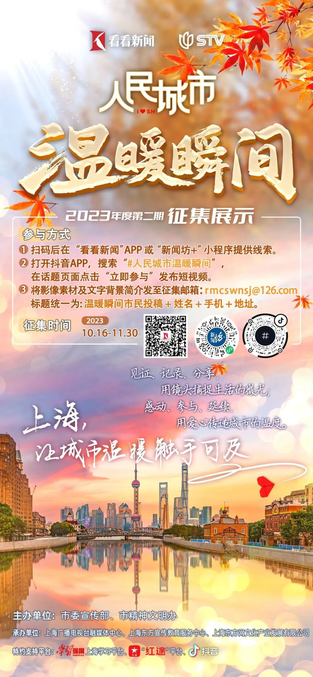 用视频记录2023年6月以来身边的好人好事、凡人善举、闪光时刻、温暖瞬间(包括但不限于手机、行车记录仪、摄像头等各类器材拍摄的视频和图片素材)。2.视频或图片均提供原文件,不需加滤镜、配乐、包装。4.请保证相关影像素材不得侵犯第三方版权,主办方在非营利前提下拥有对素材的使用权。征集截止后,主办方将综合各方推荐的“温暖瞬间”线索,遴选出2023年第二期年度“温暖瞬间”,于12月下旬在上海广播电视台新闻综合频道《新闻坊》栏目陆续播出,并在“上海发布”“文明上海”“申音嘹亮”等微信公众号,“学习强国”上海学习平台、“红途”平台发布。若你提供的线索被采纳为年度“温暖瞬间”,将获得主办方提供的“2023年度温暖推荐官”证书,并收获文创产品礼包!本次活动由中共上海市委宣传部、市精神文明建设委员会办公室主办,上海广播电视台融媒体中心、上海东方宣传教育服务中心(上海市公益广告协调中心)、上海东方网文化产业发展有限公司承办,各区委办宣传部门、“学习强国”上海学习平台、“红途”平台、抖音等支持。图文:申音嘹亮公众号