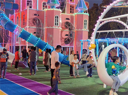 眼前这个4000平方米的超大型户外儿童亲子乐园于10月14日正式开业,当天便吸引上万名市民前来游玩体验,这也是德百商圈延伸消费体验链条引入的休闲娱乐项目,也为该区域室外“夜经济”增添了可玩度,拓展了体验感。“随着儿童亲子乐园的投入运营,德百商圈将覆盖老中青幼全年龄段的‘夜经济’受众群体,更适合全家总动员出行消费。”禹城市德百广场总经理程坤说。