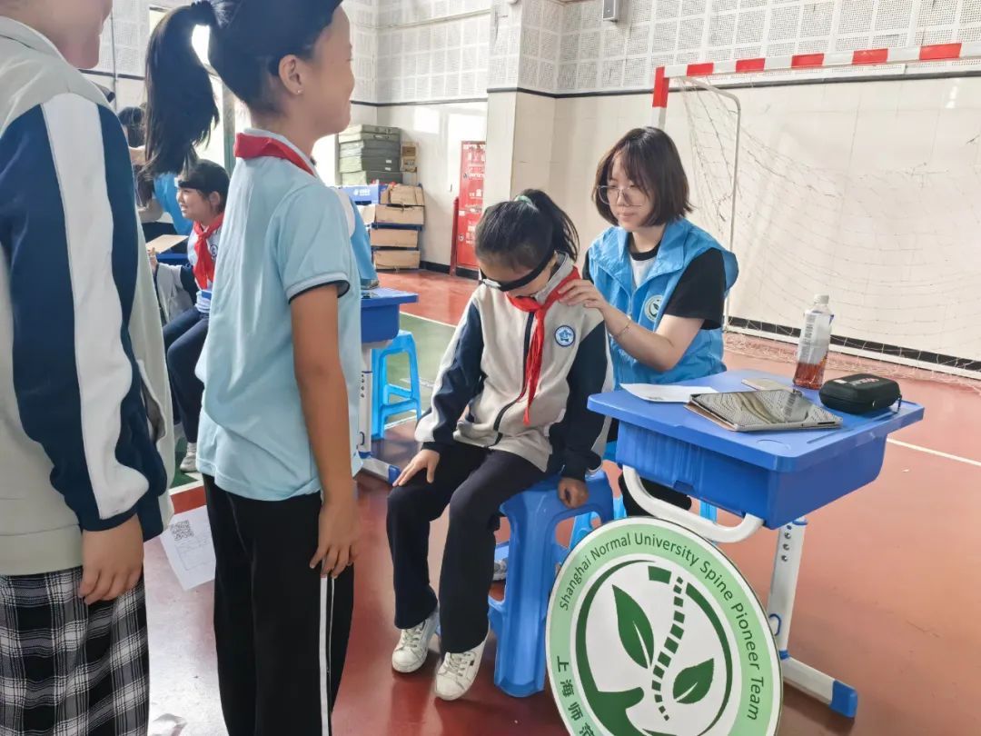 帮孩子们做检查的,是上海师范大学袁凌燕教授率领的的“脊先锋”团队。从2018年起,袁凌燕团队便致力于青少年脊柱侧弯防控项目研发与科普推广,先后产出“青少年脊柱保健操”、《青少年脊柱健康指导手册》、综合社会实践课等成果。这次是他们团队第一次在学校中对学生进行脊柱健康大普查,并结合对教师展开的脊柱健康知识和技能培训,对脊柱问题和不良习惯早筛查、早发现、早干预,真正实现在日常学习生活中守护孩子们的脊柱健康。