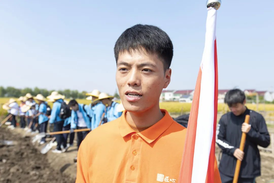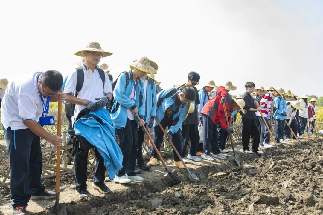 在基地教官的带领下,来自奉贤中等专业学校2年5班的同学们来到“开垦挖渠”点位,他们的任务是将田地挖成每条宽30公分、高10公分的地垄,同学们手持铁锹,松土、挖渠,用力开垦着自己的地垄,整个劳动场面热火朝天。