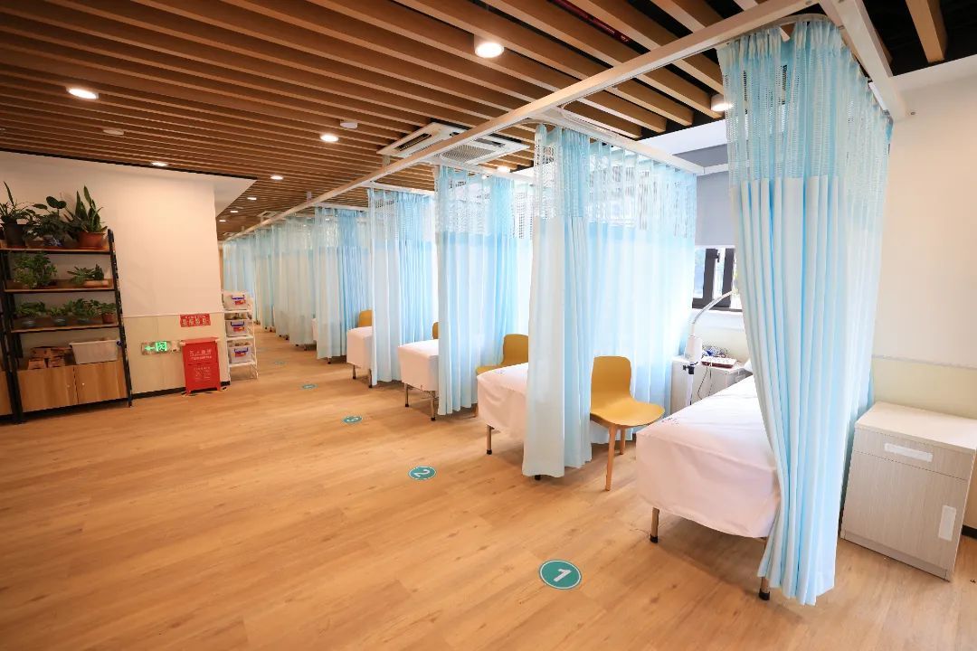 二楼中医区域突出现代中医风格,设有中医智能体验区,新增体质辨识仪、电子艾灸仪等智能中医设备。治疗区进行一体化整合,治疗床扩增至12张。同时,中心还开设中医肾病、中医脾胃病等专病门诊,为居民提供一站式、多元化的中医药特色服务。