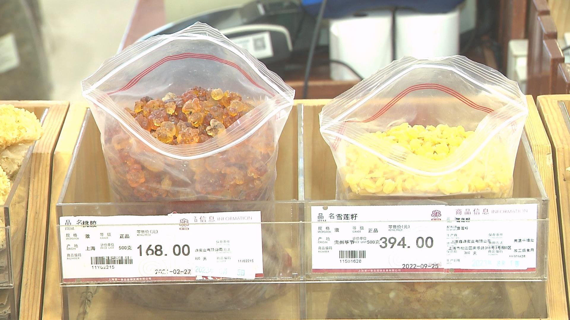 白木耳、红枣、桂圆、桃胶等都是这段时间市民养生不错的食材。市民可以根据自身情况进行选择组合,炖羹养生。营业员告诉记者,高山银耳雪莲子炖桃胶具有滋阴润肺的功效。高山银耳主要作用就是润肺,桃胶可以调节我们的肠胃,雪莲子可以降低血脂血糖,它们是一个最佳的搭档。煮这个产品的话需要提前泡4个小时,这样口感是最好的,比较糯,很润肺。还有一种产品就是现在需要补气补血的。桂圆属于温性产品,补气作用很大。红枣也是补血补气的,加上莲子炖在一起,是一个口感很好的甜汤,在这个季节是很不错的。