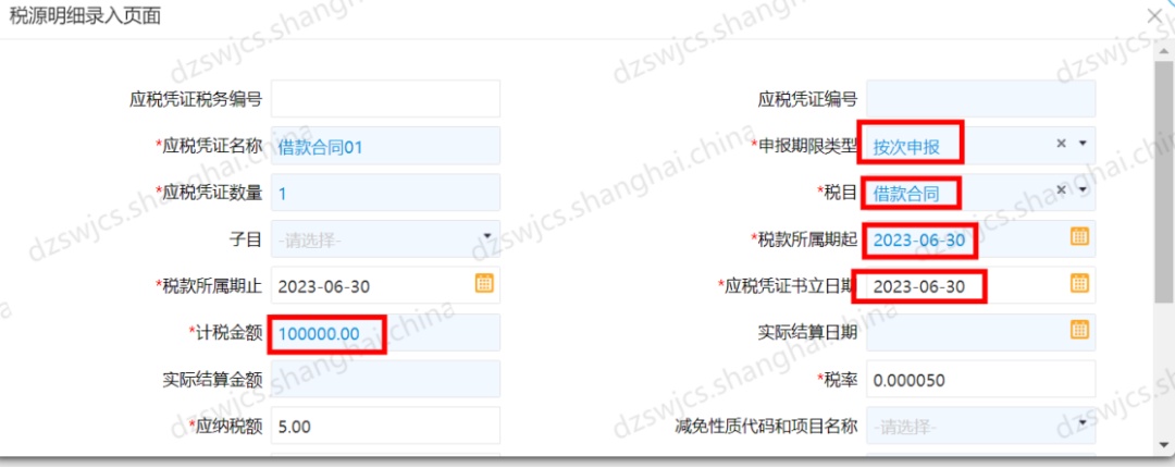 进入税源明细录入页面进行填写,打*的为必填项,申报期限类型可选择“按期”或“按次”。此处以“按次申报”为例。