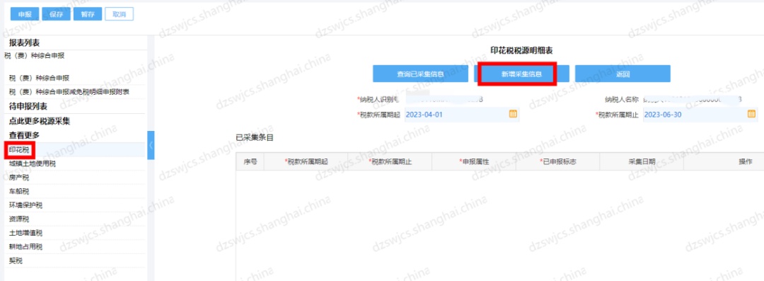 选择印花税——【税源采集】,进入印花税税源明细表,点击【新增采集信息】。