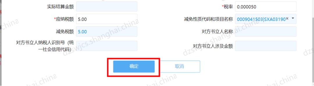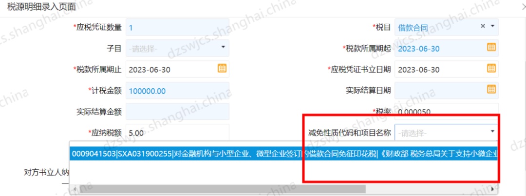“减免性质代码和项目名称”选择“0009041503,对金融机构与小型企业、微型企业签订的借款合同免征印花税”,点击【确定】。