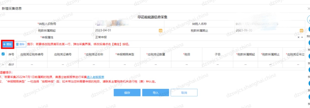 选择税款所属期,点击【增加】,进行税源明细数据采集。