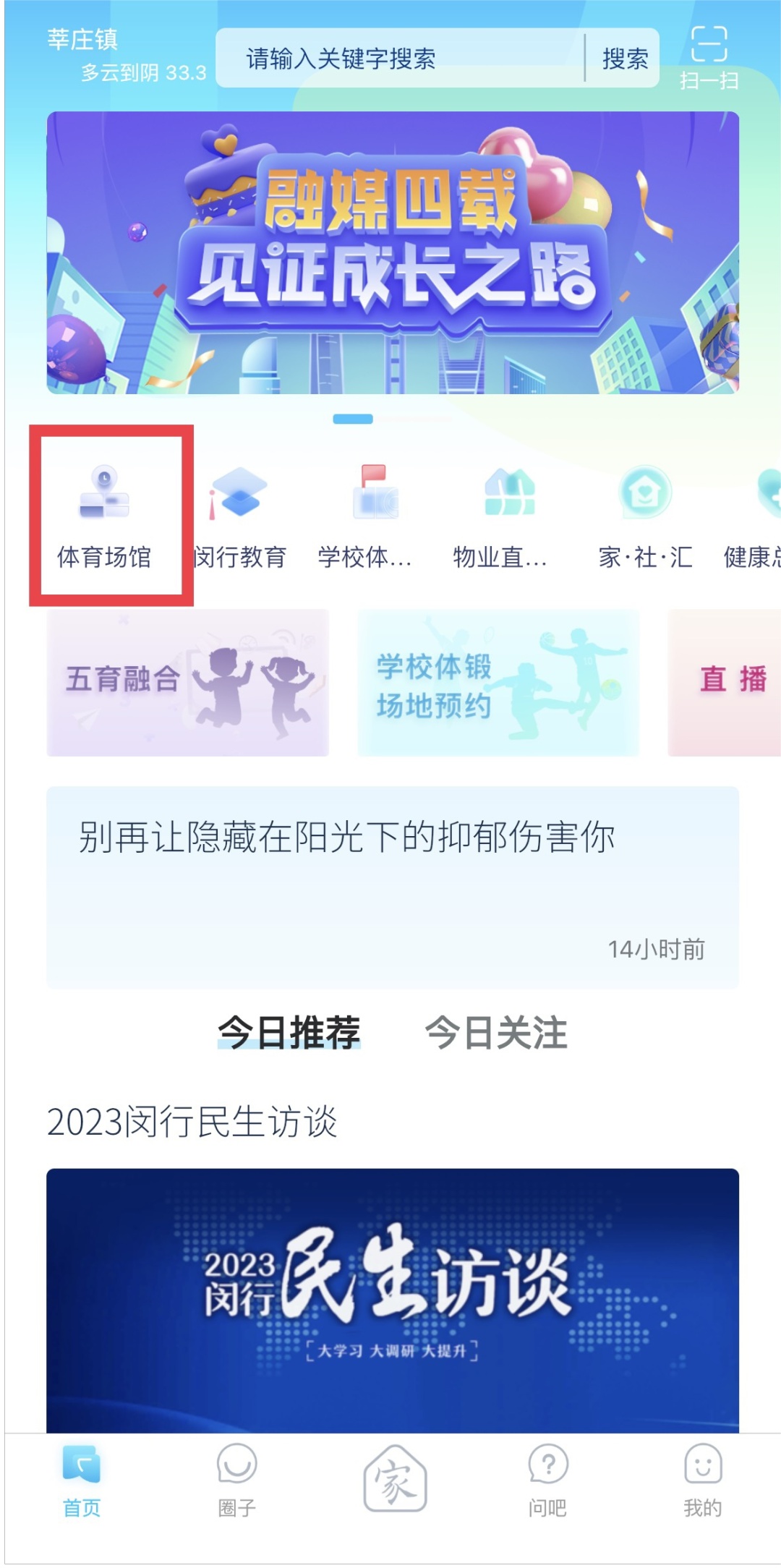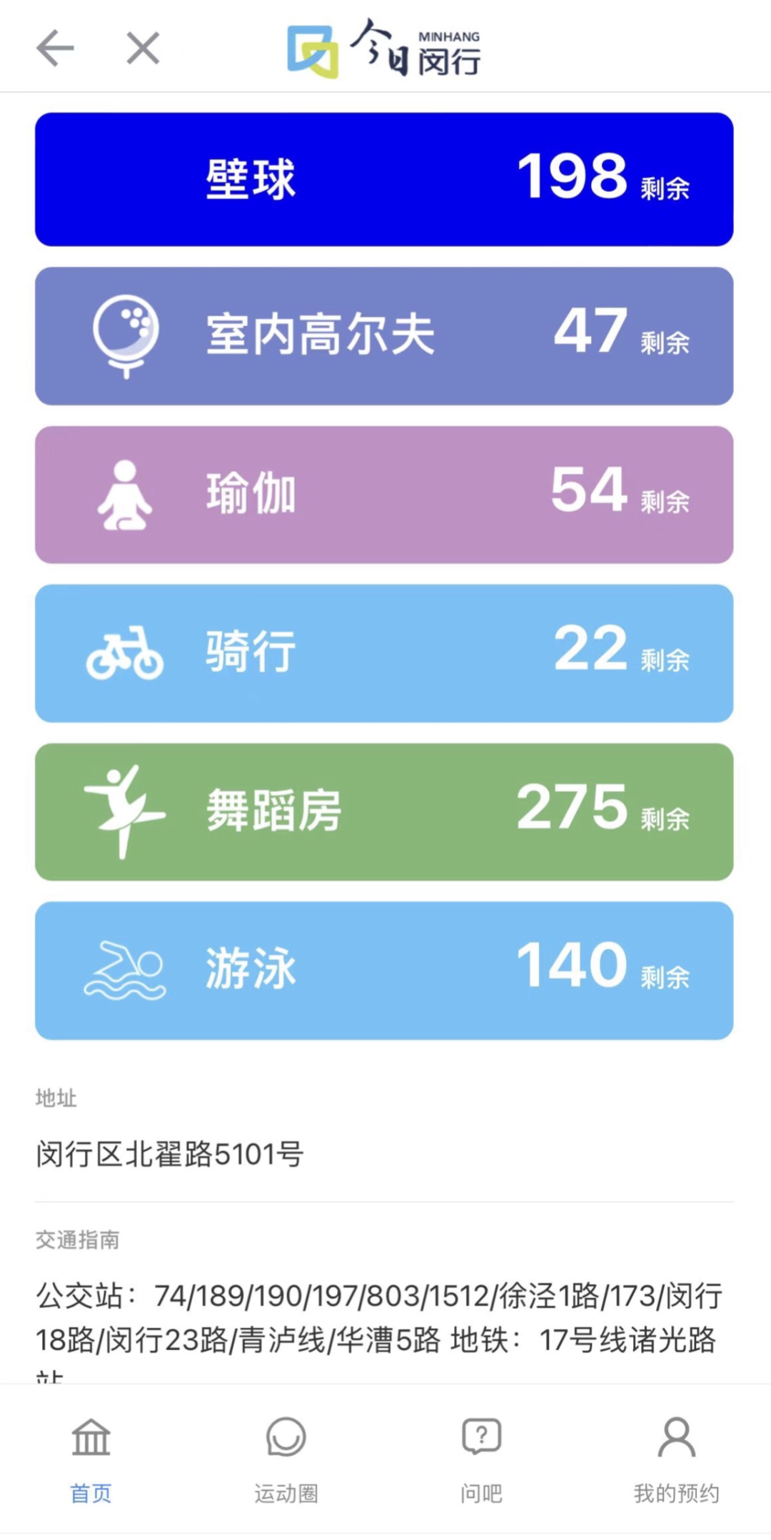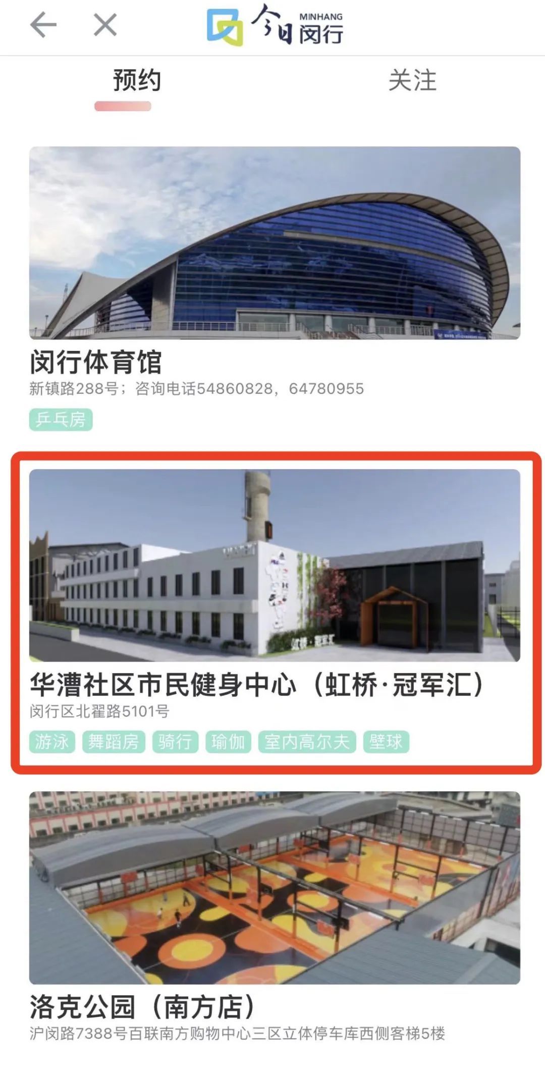 这次在“今日闵行”APP上开放公益场次,可预约的项目是羽毛球、乒乓球、壁球、游泳、舞蹈、篮球和室内高尔夫。周一至周五9:00-12:00 25元/90分钟/场(每场限制30人)周一至周五12:00-18:00 30元/90分钟/场(每场限制20人)周六至周日(节假期)9:00-20:00 35元/90分钟/场(限制30人)羽毛球:周一至周五9:00-13:00 50元/小时/场篮球:周一至周五9:00-13:00 50元/人/小时周六、周日(节假日)9:00-20:00 35元/场/小时注意:以上公益场次仅在“今日闵行”app预约可享哟!3.下拉列表找到“华漕社区市民健身中心(虹桥·冠军汇)”记者:毛海萍
