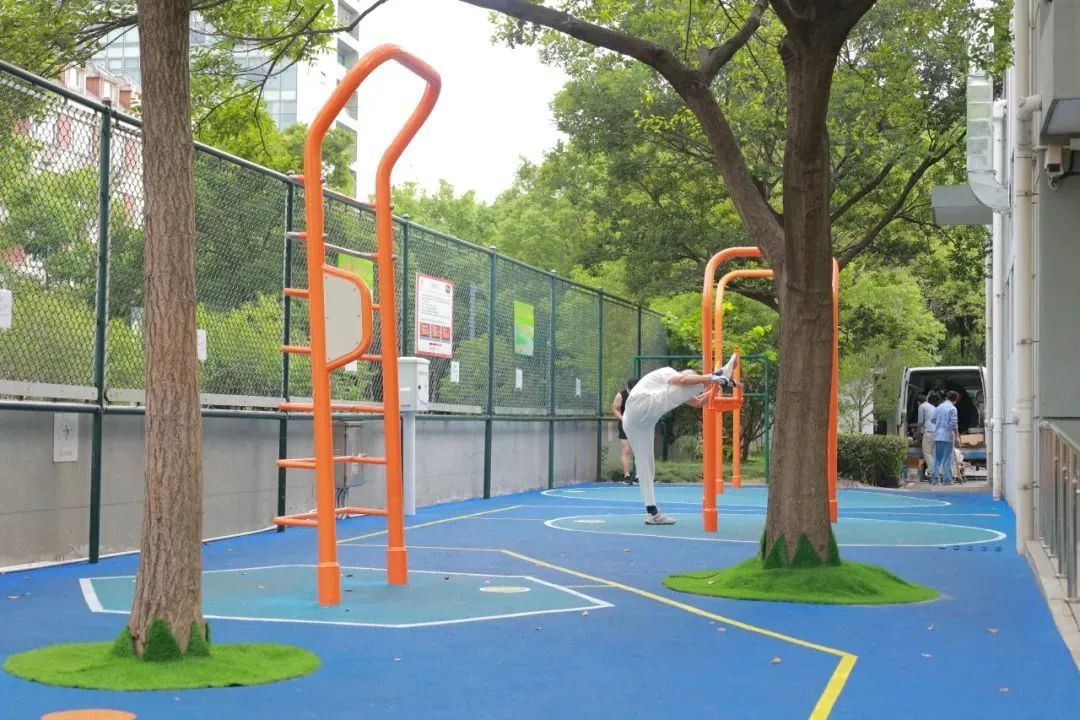 在场地西侧的矩形地块设计改造了体能训练场,设置智能高低杠、智能双杠、智能肋木架等健身设施,可提供运动计数、计时、语音播报等服务;并绘制了地面热身图形训练,包括高抬腿、开合跳、俯卧推、弓步拉伸等图形标识,便于市民提前做好体能锻炼的预热准备。场地以鲜明的颜色碰撞,焕发运动活力,体吸引了不少锻炼爱好者的目光,许多市民利用器械进行拉伸放松,肌肉力量训练,展现宝山市民积极向上的健身风采。