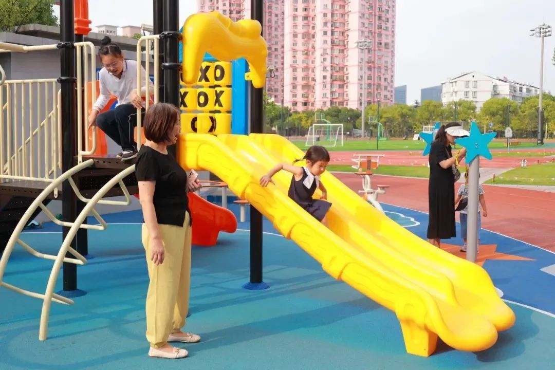 原先宝山体育中心户外场地服务人群主要以青少年以上的市民群众,对幼龄群体(0-3岁)考虑不足。因此在本次改造中进行功能性的补充,增添儿童趣味滑梯、星月秋千、旋转杆、骑马机、敏捷训练器等多种儿童游乐设施。开放当天,亲子氛围浓厚,吸引大量家长和儿童自发使用各项游戏设施。