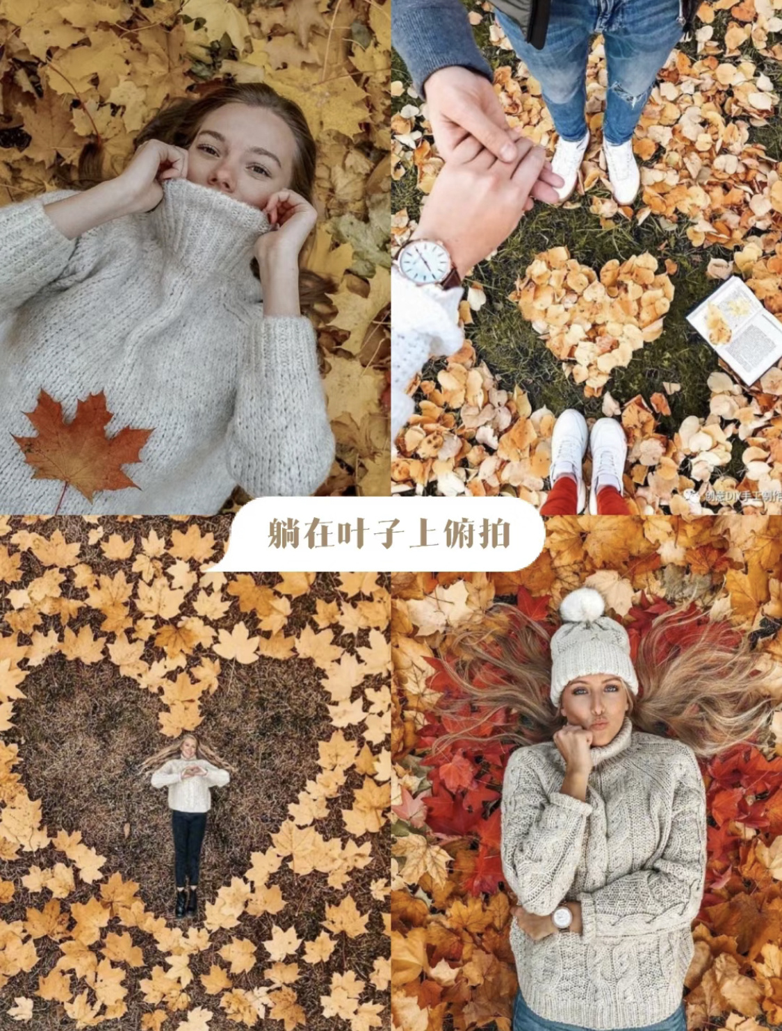 落叶是秋天永恒的主旋律,我们可以选一处树叶比较多、比较干净的地方,躺在树叶上,由摄影师俯拍,这样的照片有很强的视觉冲击力。