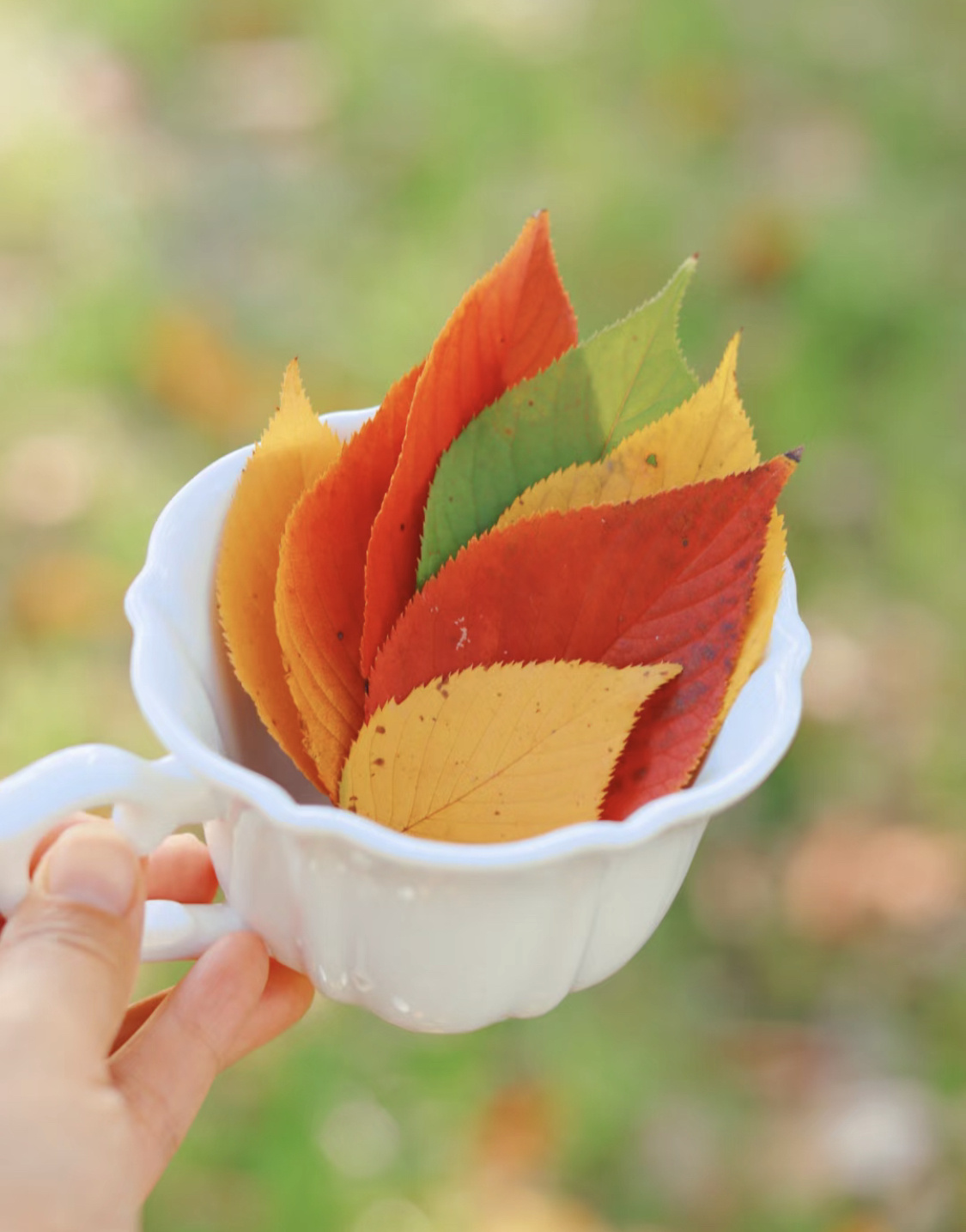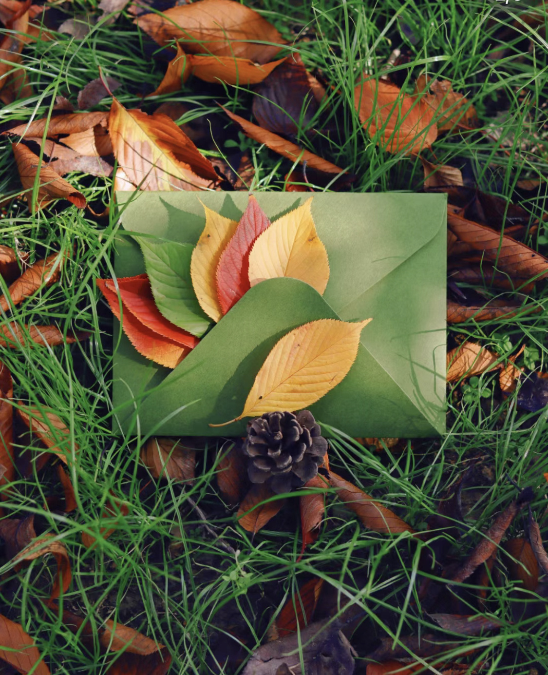 寻找不同色彩的树叶,将它们按一定顺序进行排列,从绿到黄,从黄到棕,再从棕到红。也可以搭配一些充满文艺气息的小物件,这样一张照片完整呈现了秋天迷人的色彩变化。
