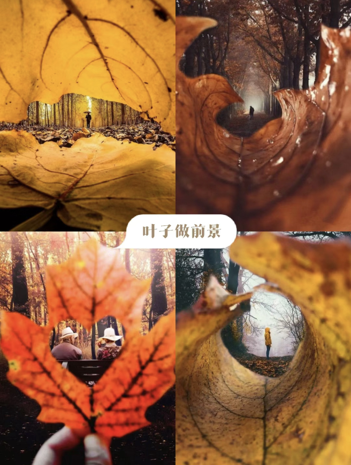 拿起一片树叶,将其卷曲或剪出一个爱心状的小洞,形成一个框架构图,放在相机或镜头前,人物站在远处。这样的视角让人印象深刻,达到一个绝佳的画面效果。在突出落叶的同时,让环境营造出故事感。