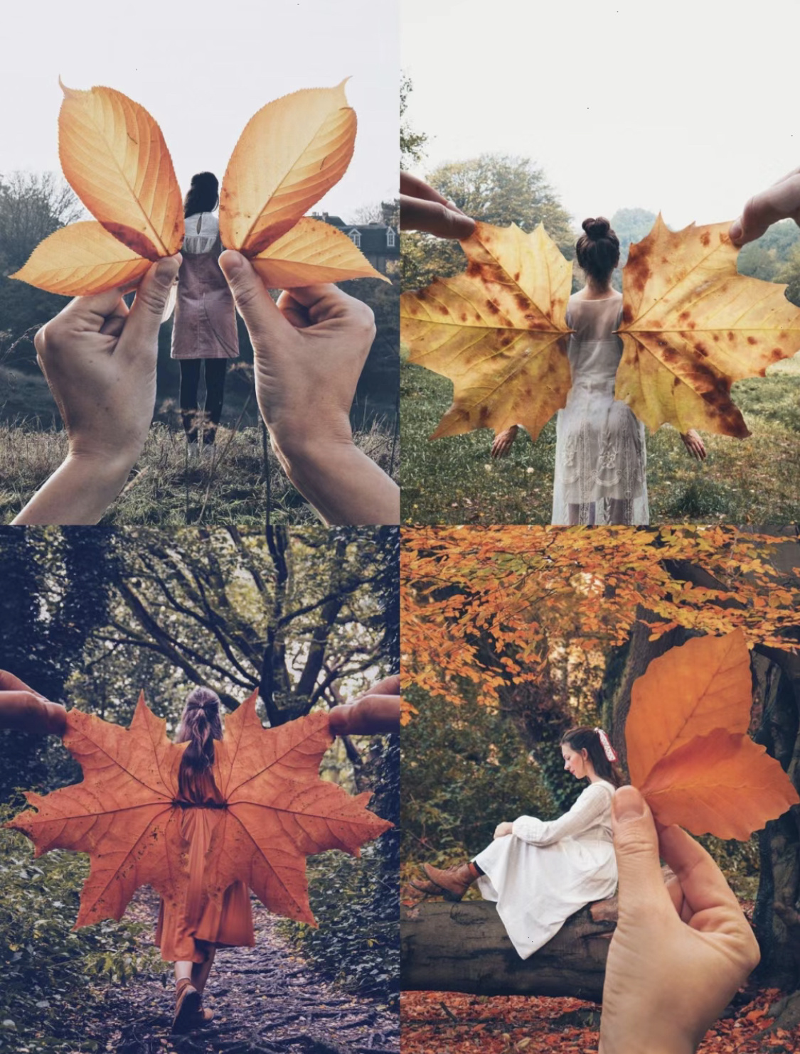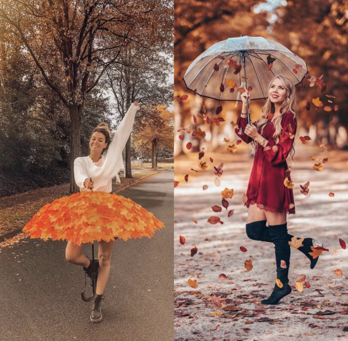用雨伞做道具,将收集好的树叶放置在雨伞内。撑开雨伞时,树叶会飘飘悠悠的落下来,赶紧抓拍下这个瞬间。记得把头微微低下,仿佛要躲雨的样子,就不会拍到正脸,又营造出秋日故事感。