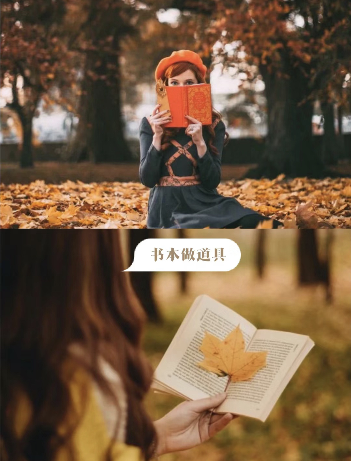 又比如下面这一张照片,捡一片落叶放在书中间,这样的照片也很有趣,文艺感满满。