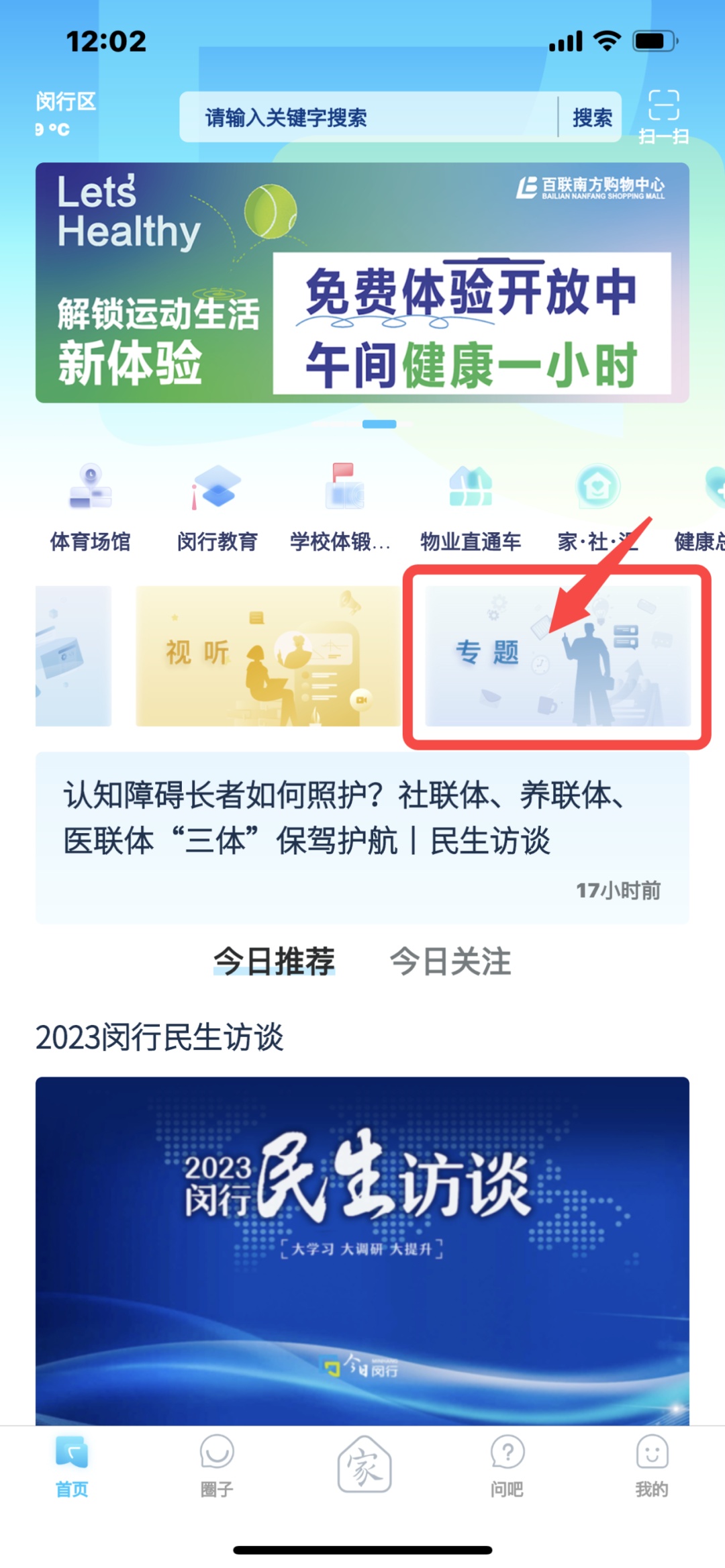 2.进入“今日闵行APP”滑动腰带,点击“专题”板块,就可以进入“修齐讲堂”专栏,畅游书海啦~