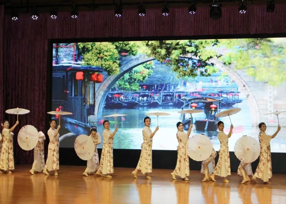此外,在本次比赛的参赛团队中,我们还能看到不少活跃于各类市、区级广场舞比赛的“熟面孔”。作为闵行区广场舞代表队之一,来自莘庄镇的莘纪苑舞蹈队是莘纪苑社区居民自发成立的一支舞蹈队,别看队内成员的平均年龄60多,当她们换上一身素色旗袍,撑起一把油纸伞,静静伫立在台前,便身临其境般带领观众们来到了那如诗如画的江南。