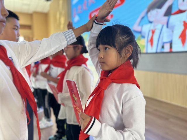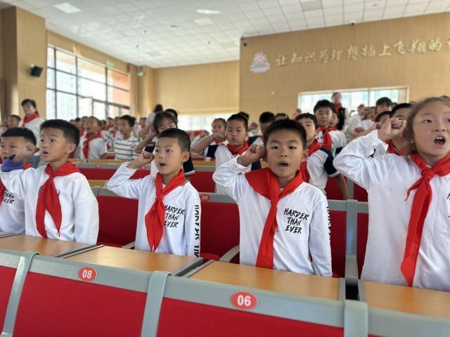 队旗招展,续写荣光。在顿挫有力的出旗曲中,入队仪式拉开了帷幕,全体队员唱响嘹亮的队歌。随后,由少先队员代表为新队员们佩戴鲜艳的红领巾,并颁发证书,互相敬礼,同心追梦。