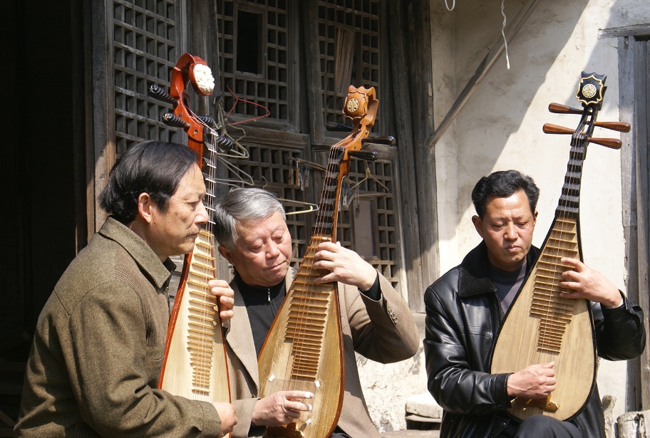 ▲非遗瀛洲古调派琵琶传承人在切磋技艺