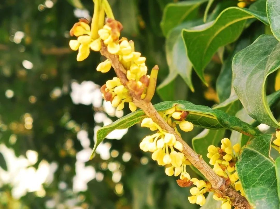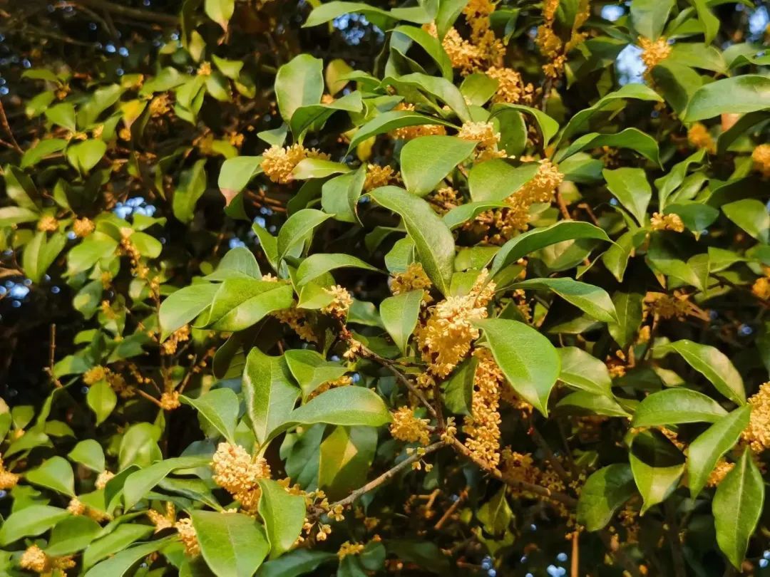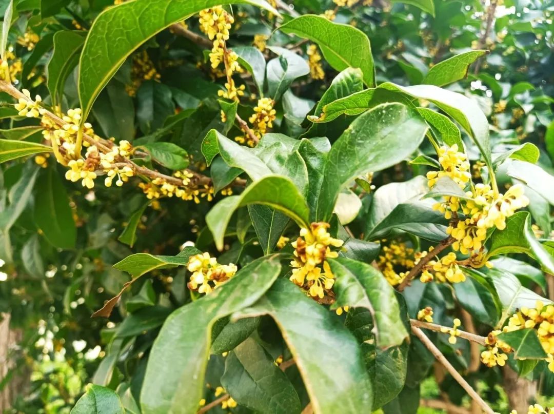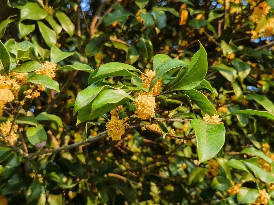 一团团、一簇簇,集聚绿叶间,摇曳在枝头。若是一阵风吹过,再来上一场桂花雨,便可以一睹一张“天然地毯”的形成。