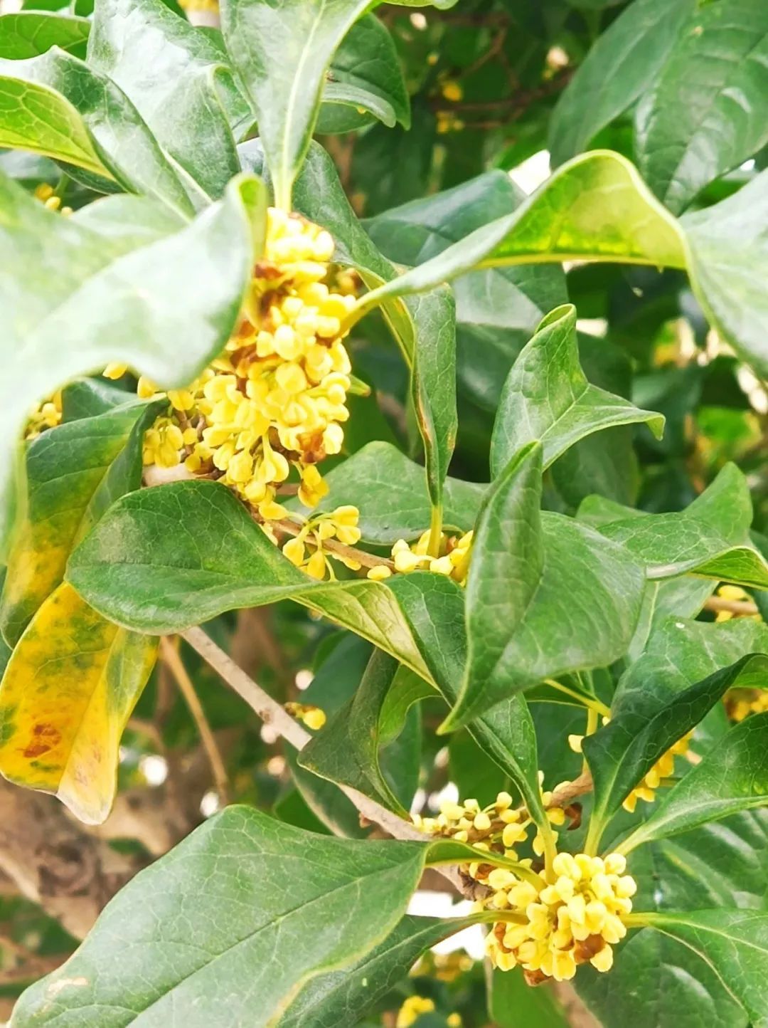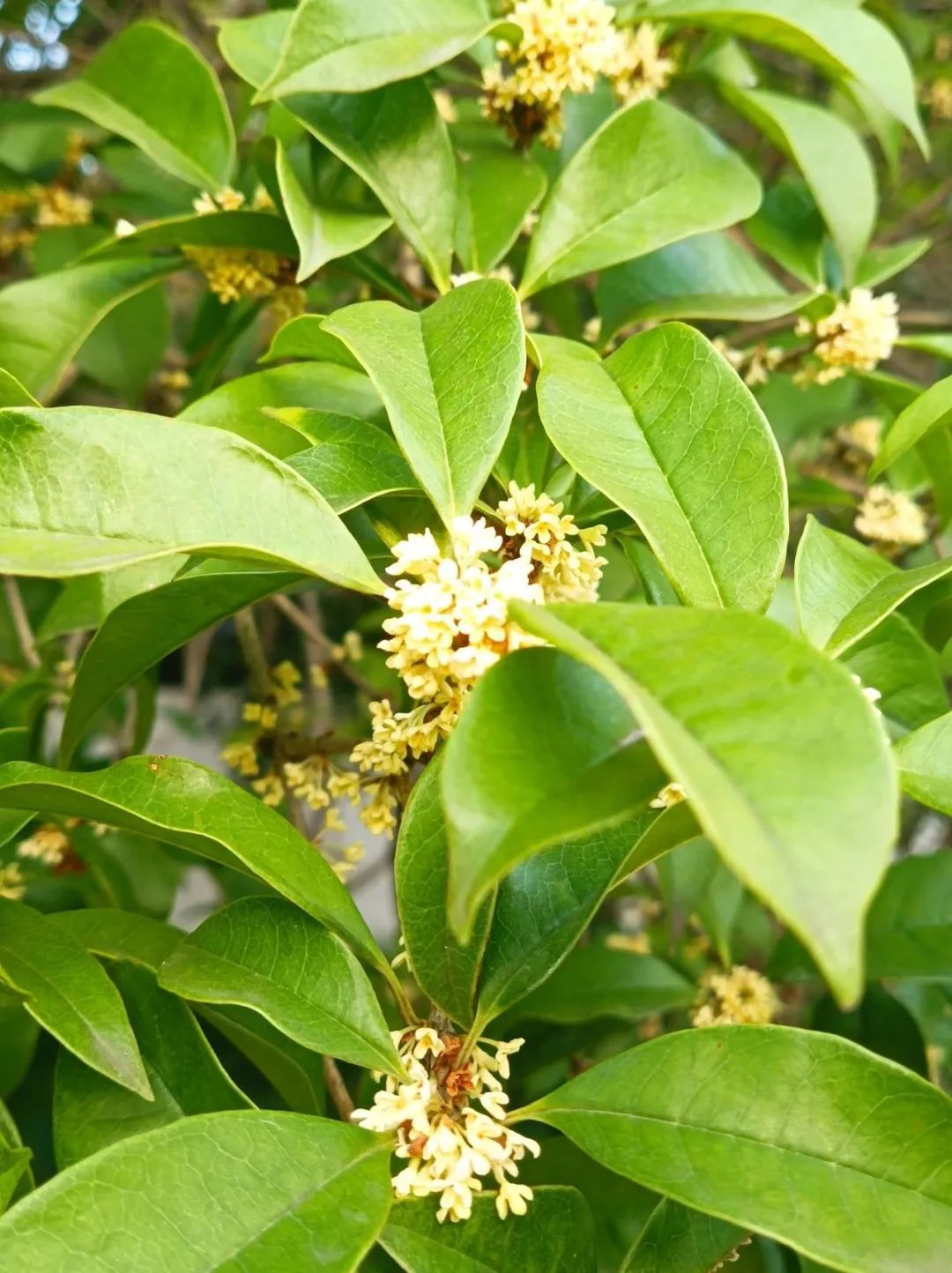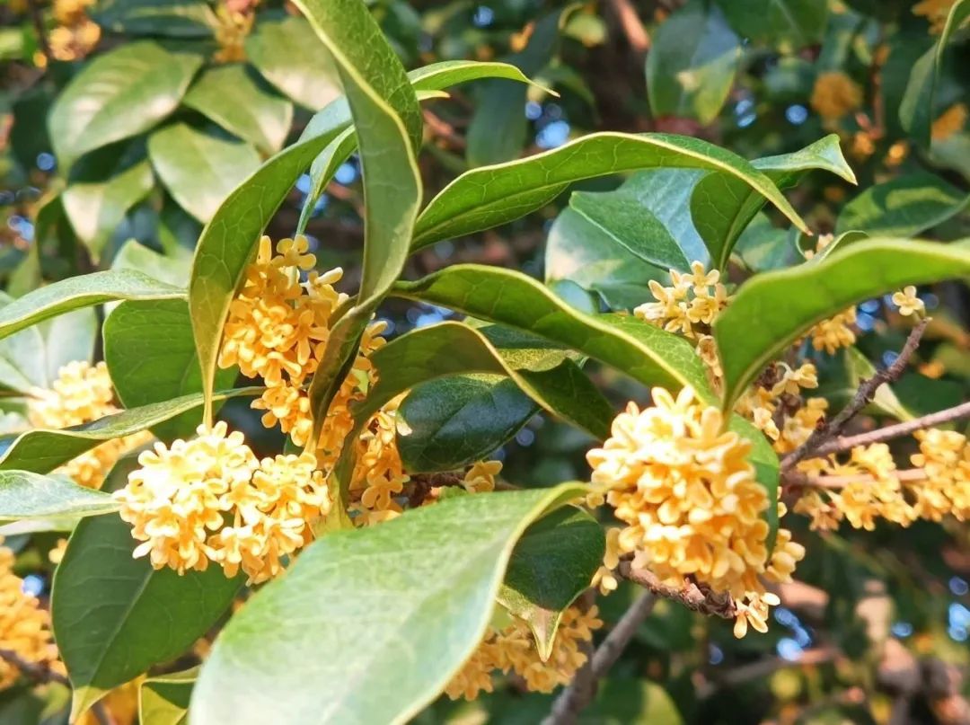一团团、一簇簇,集聚绿叶间,摇曳在枝头。若是一阵风吹过,再来上一场桂花雨,便可以一睹一张“天然地毯”的形成。