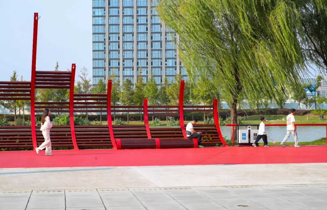公园里设置了多处亲水平台,人们可以在青青草坪上和开阔湖面旁,欣赏秋日美景。