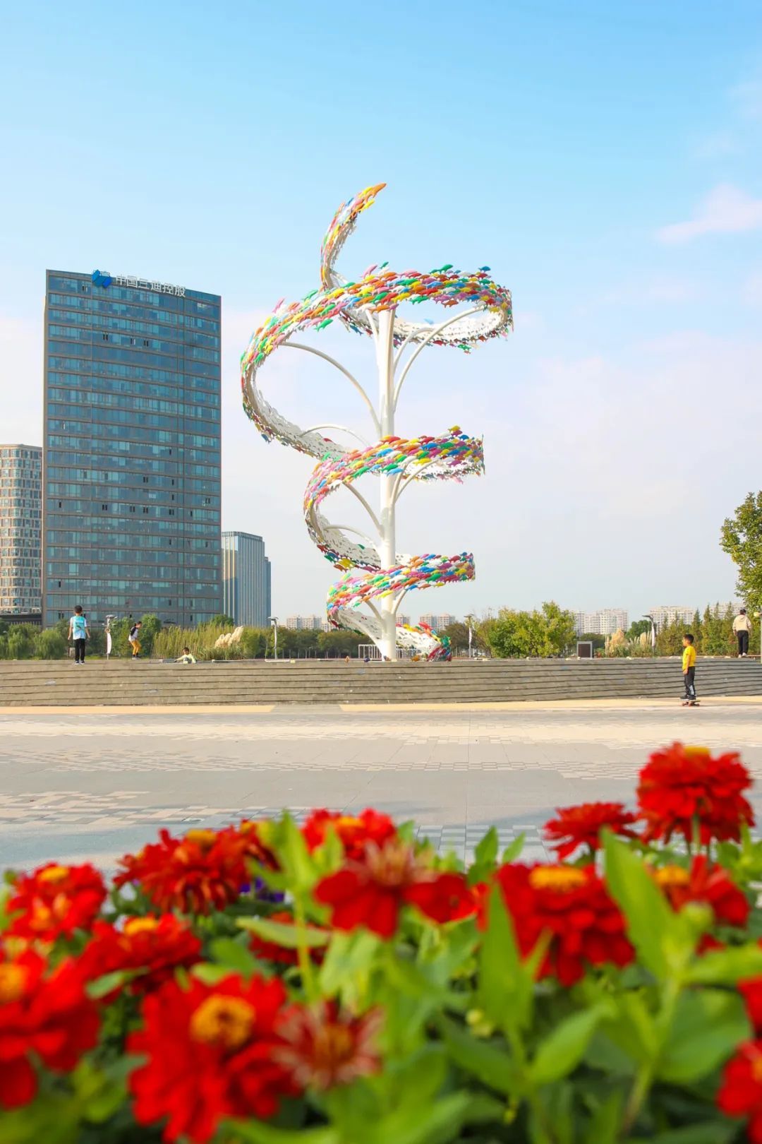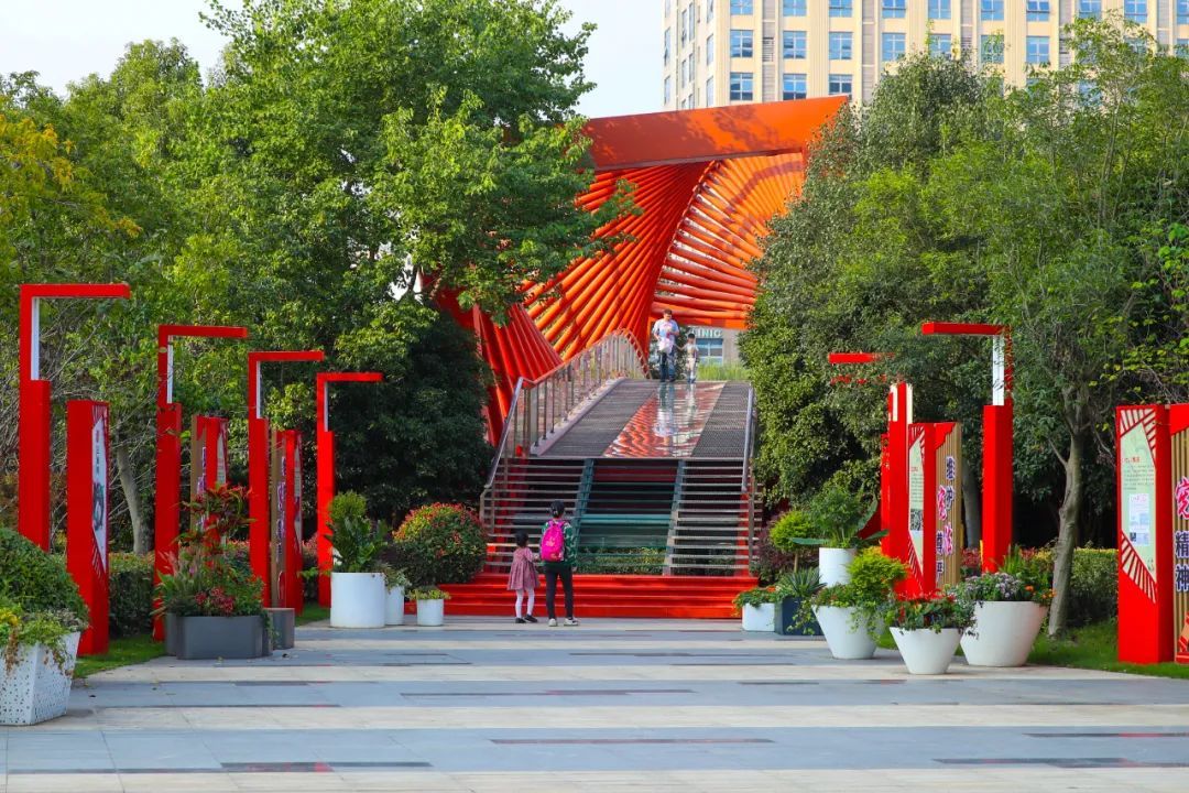 向着五龙湖南岸广场走去,十多米高的龙鱼雕塑尤为显眼。位于五龙湖西面的,则是一座有着艳红色彩、独特造型的舞龙桥,标志性的景观吸引了市民前来拍照打卡。