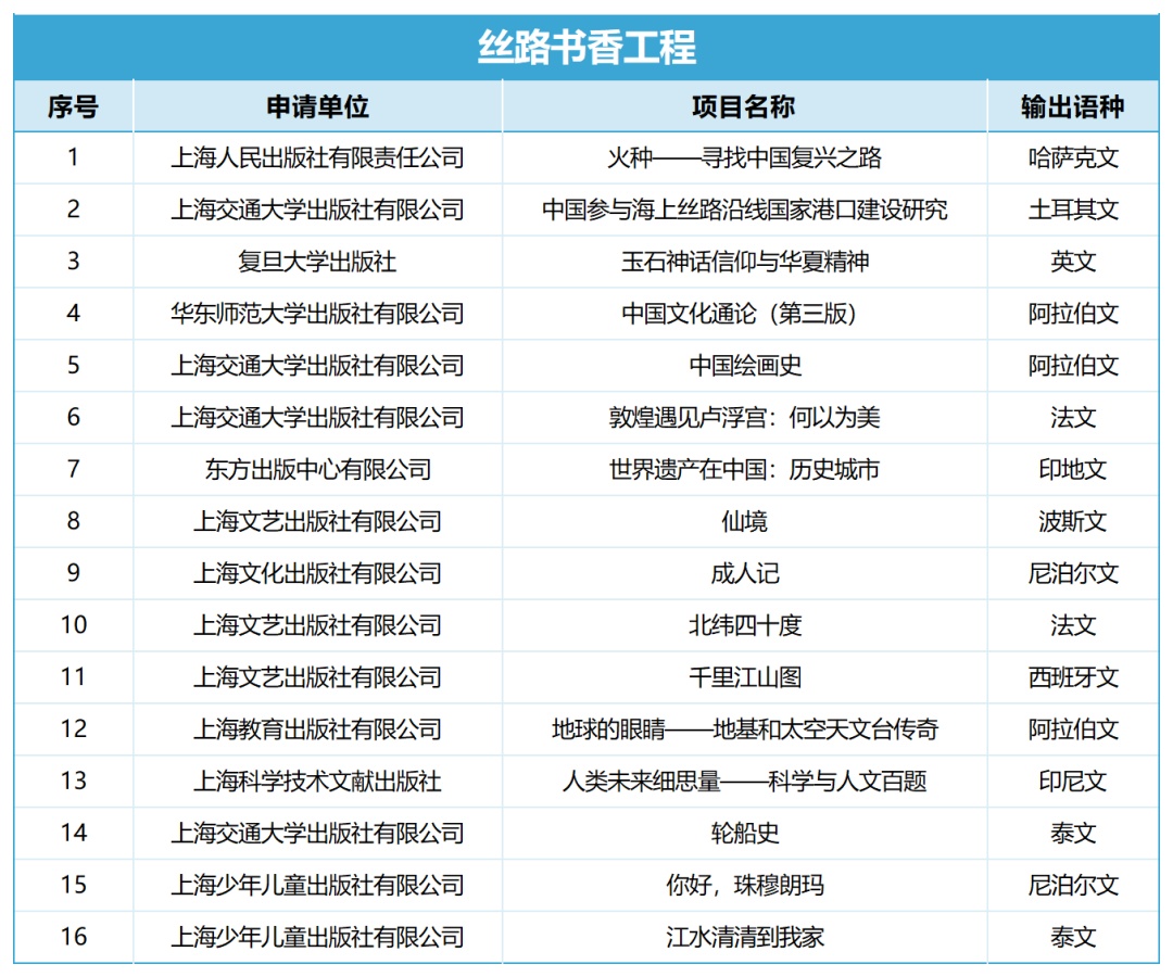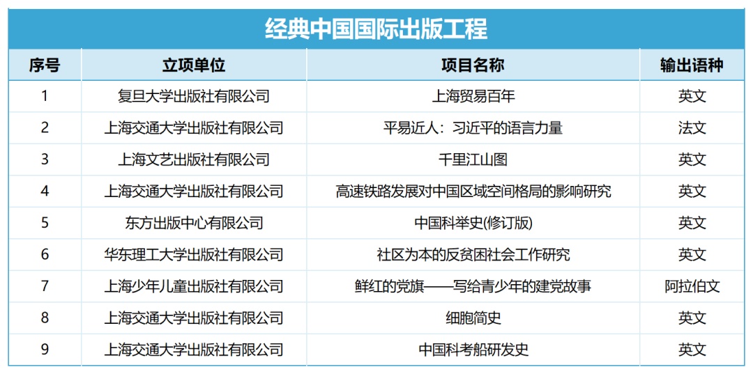 近日,经典中国国际出版工程办公室、丝路书香工程办公室分别发布了2023年“经典中国国际出版工程”和“丝路书香工程”公示名单。上海地区出版社9个项目入围2023年“经典中国国际出版工程”,16个项目入围2023年“丝路书香工程”。