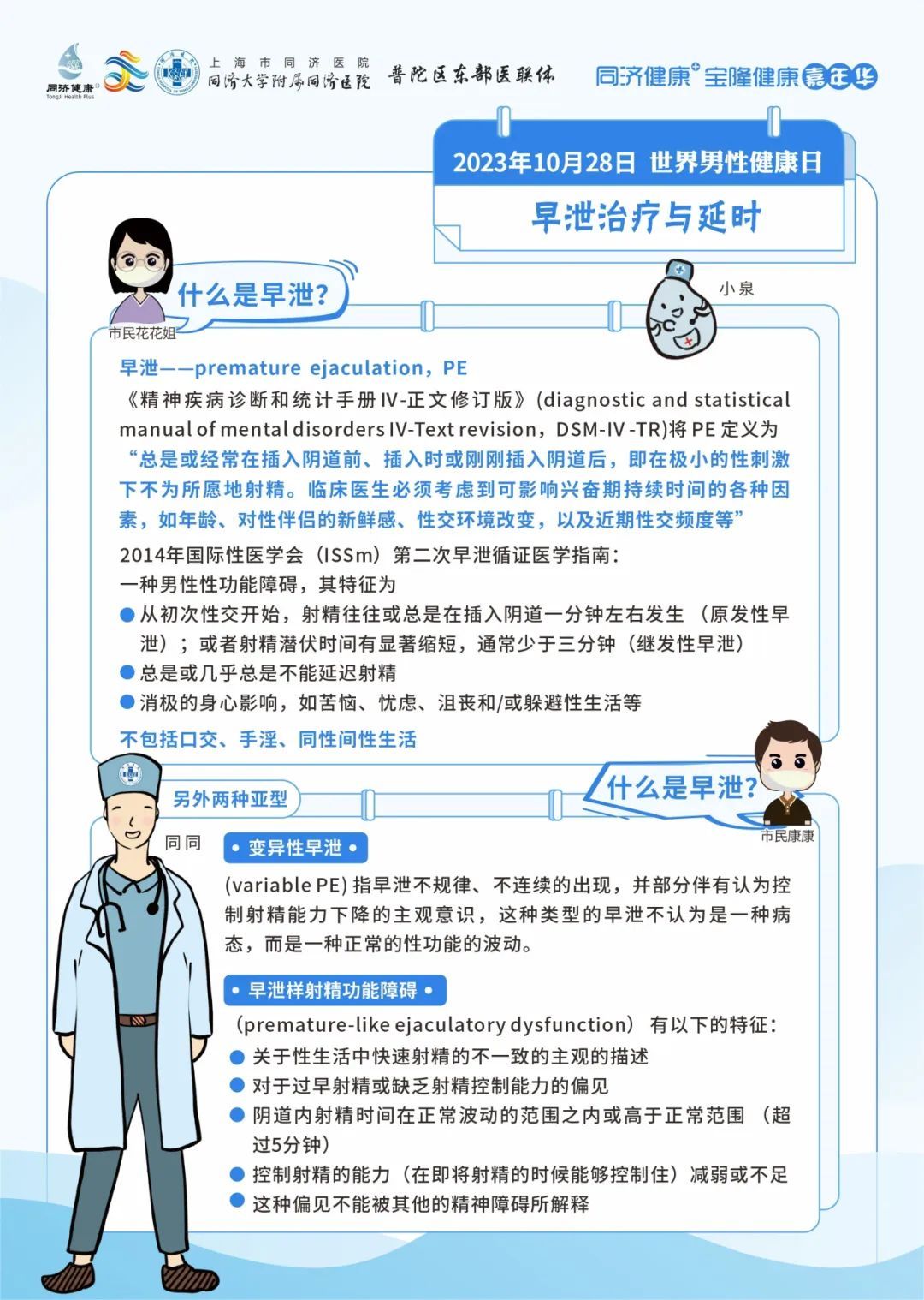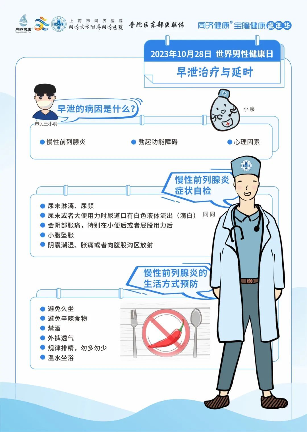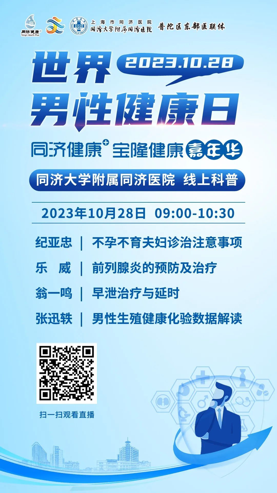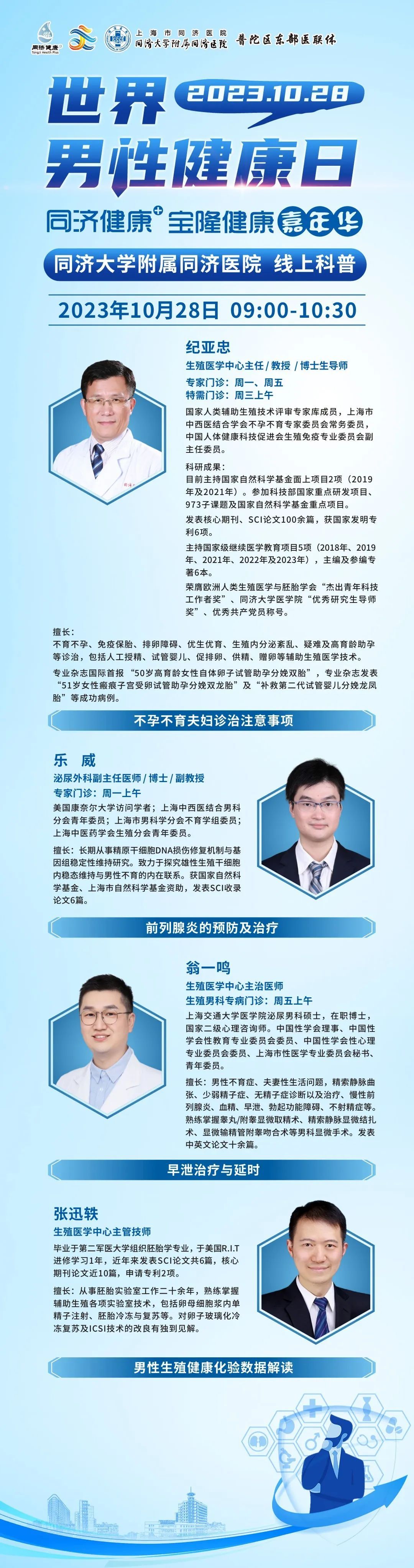 2023年10月28日上午9:00,同济大学附属同济医生殖医学中心及泌尿外科的4位专家将进行【世界男性健康日】科普直播活动。呵护男性健康,让健康不再是“男”题。愿男同胞们都能有一个健康强劲的体魄。