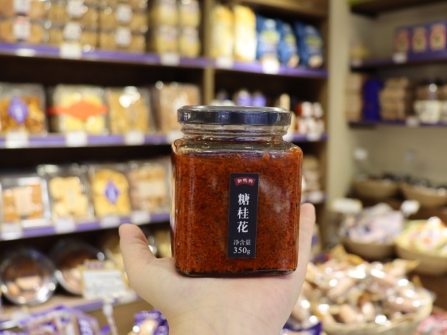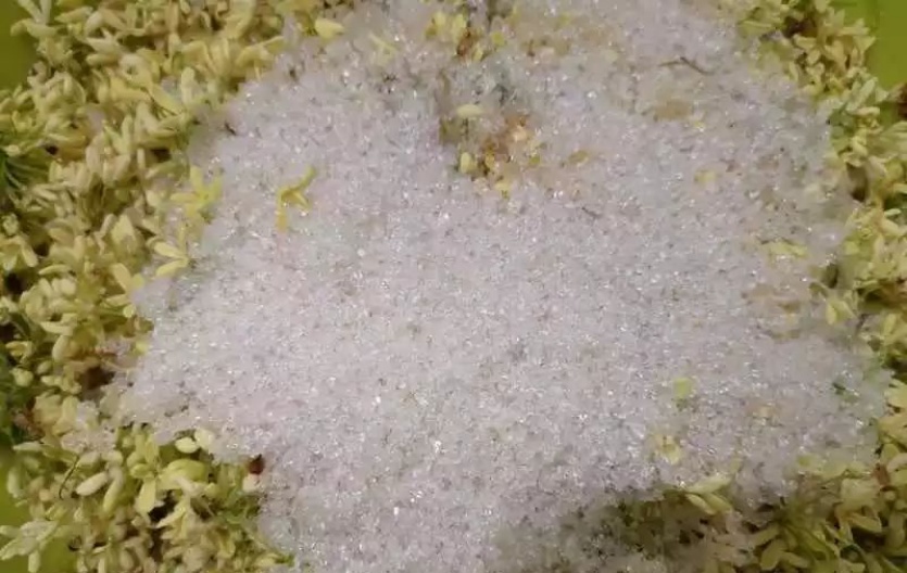 新鲜的桂花,再拌上白砂糖,用于汤圆、月饼、蜜饯等,传统点心的辅助原料,色美味香。